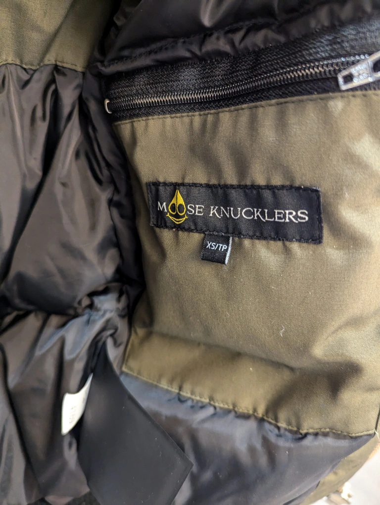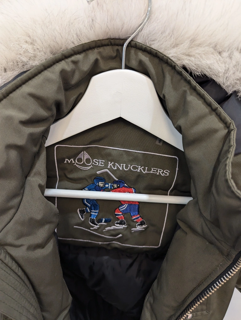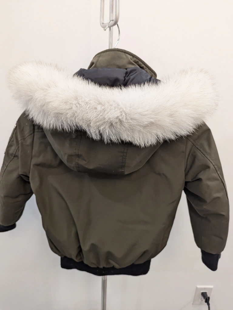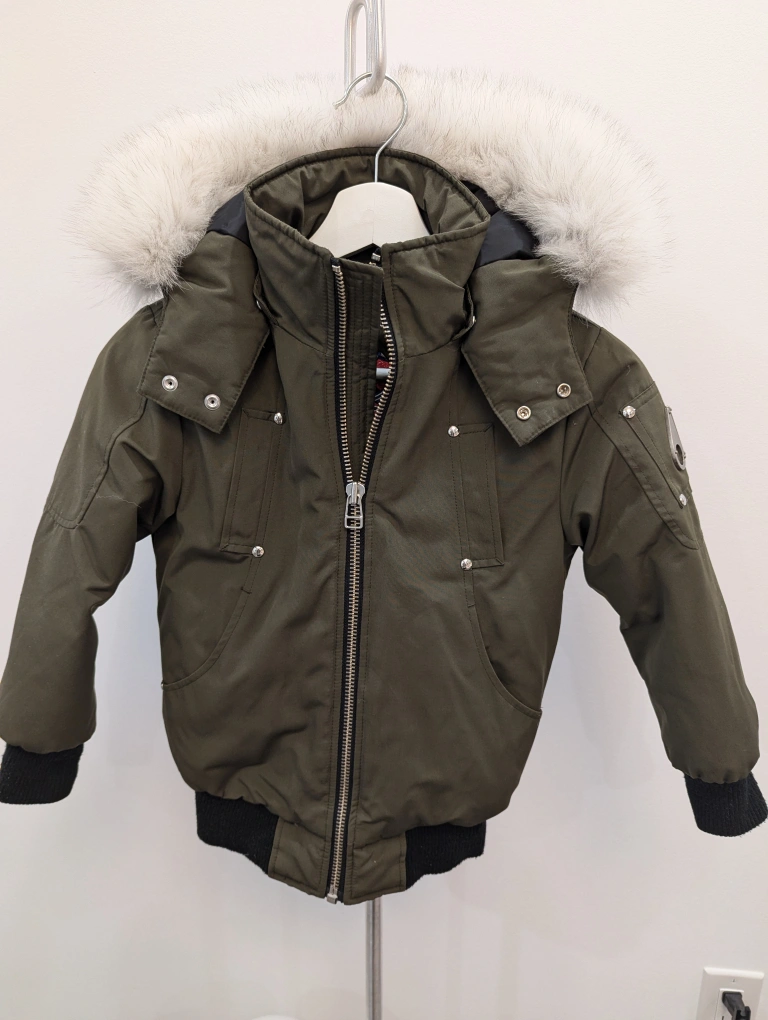 Olive Green Moose Knuckle Kids down filled bomber jacket with a white fur trim around the hood.