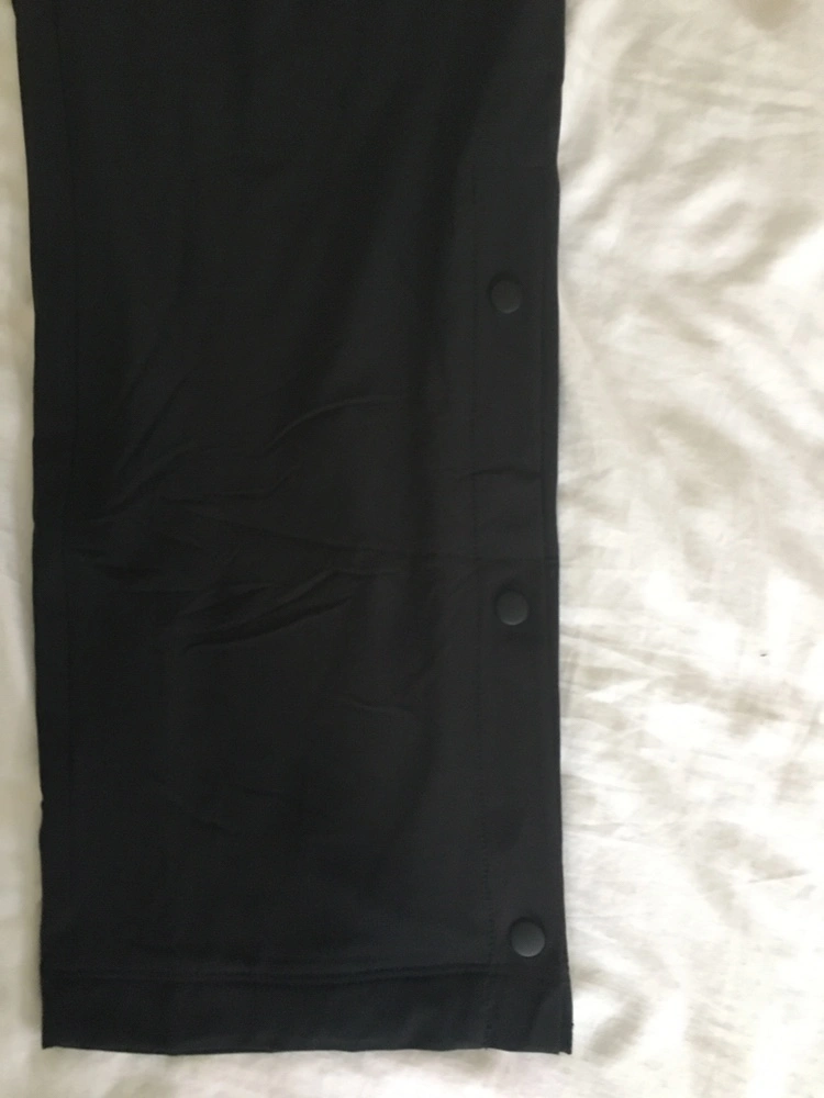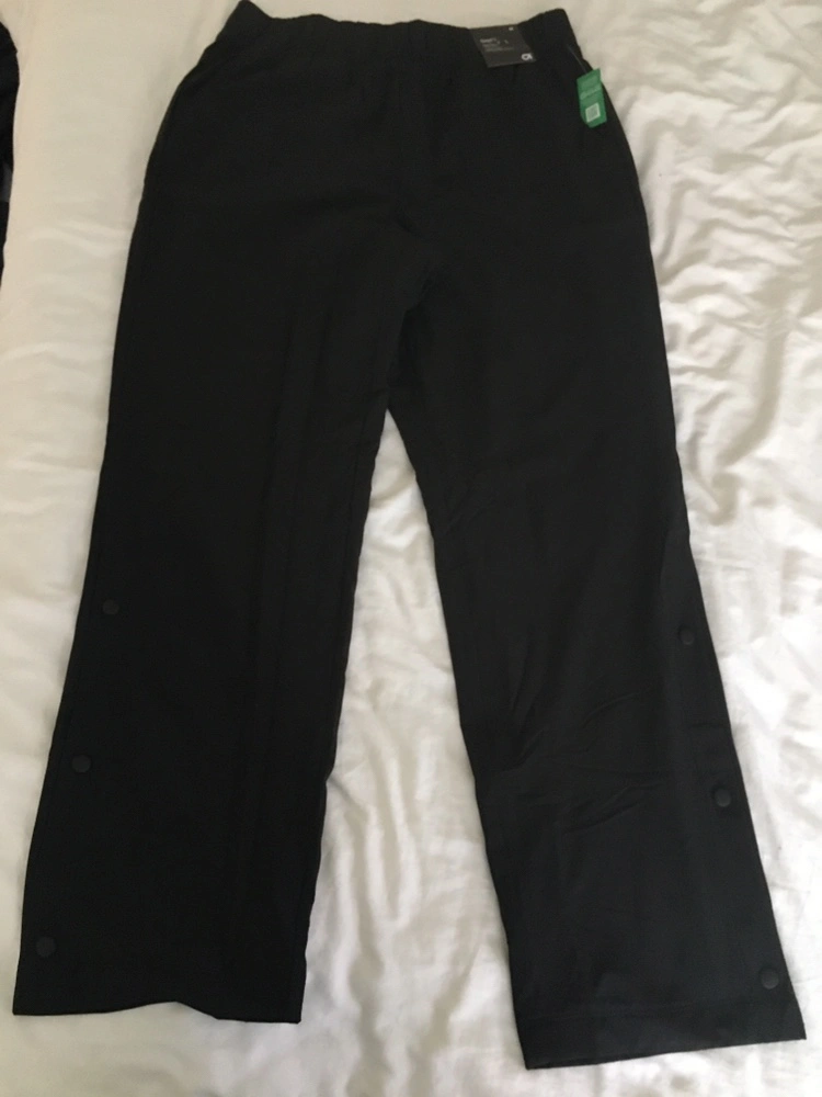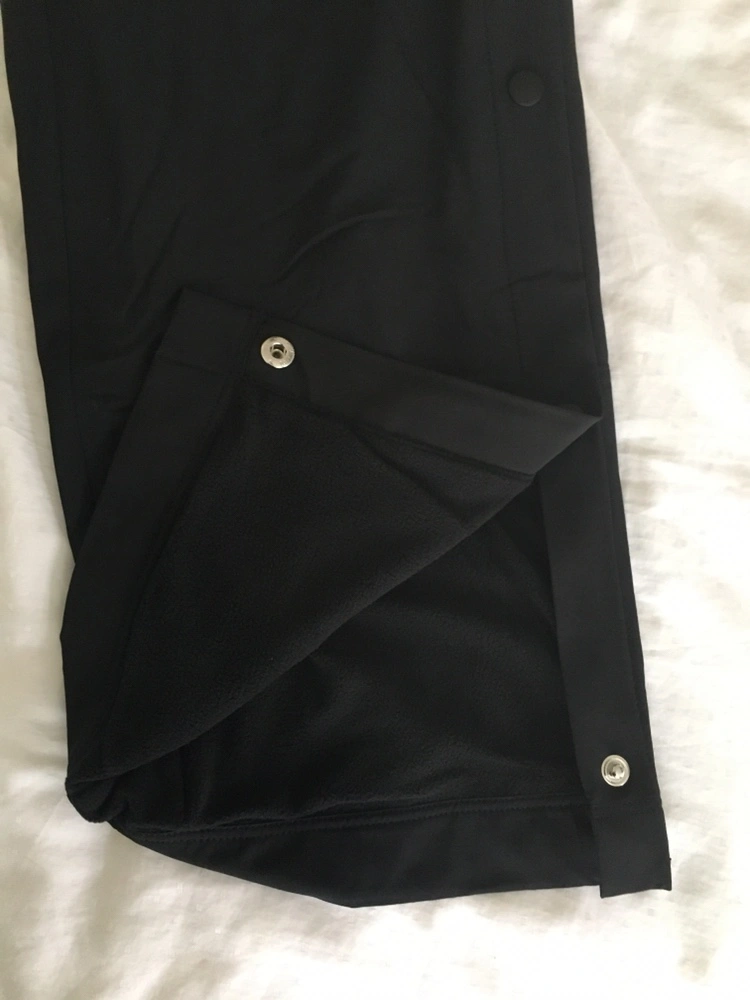 Black pants with snap detailing on the sides. These pants are fleece-lined and have an elastic waistband with a drawstring. They have a high rise. Size: Medium. Tag attached. New with tags.