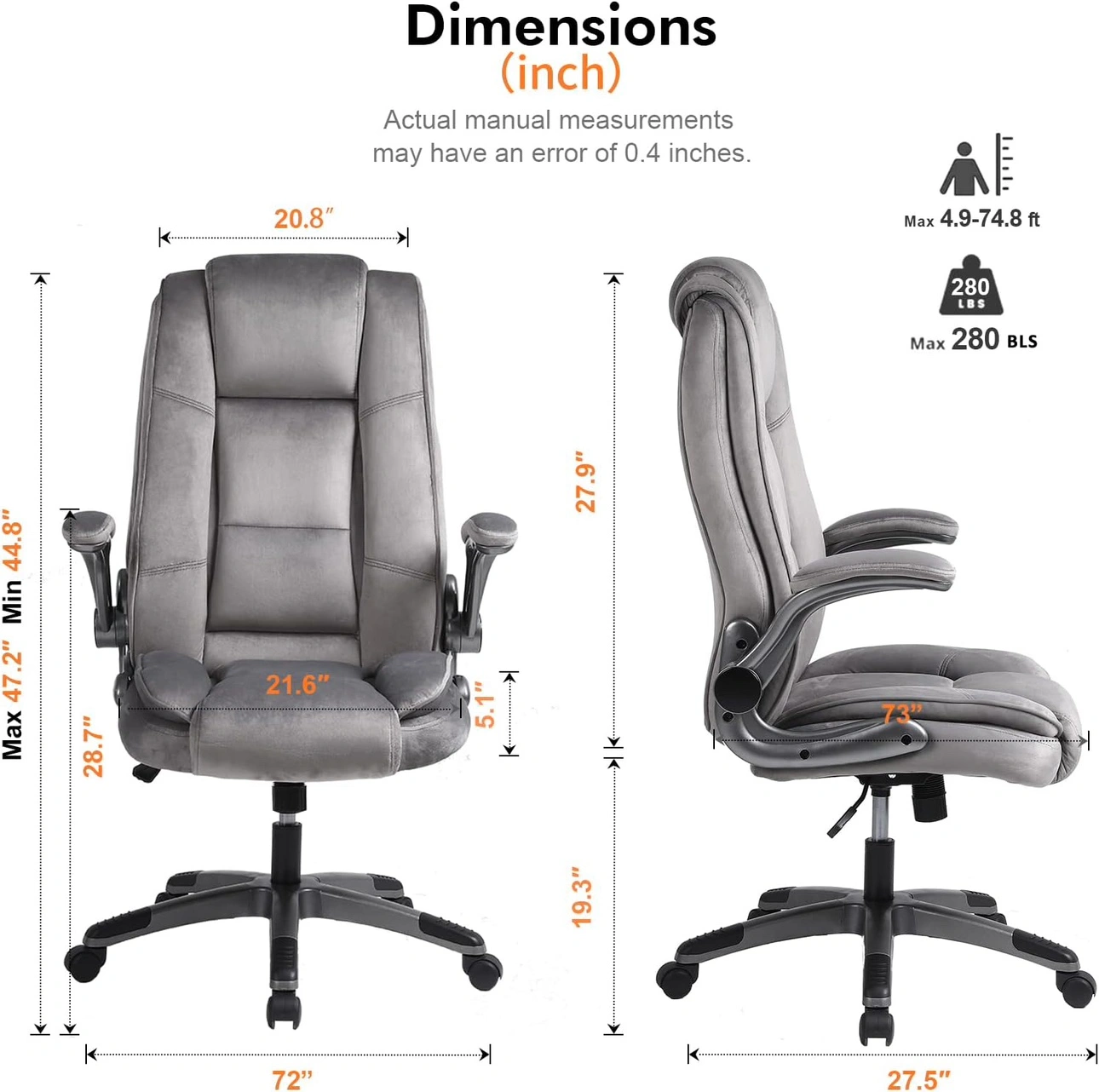 Adjustable Tilt Angle and Flip-up Arms Executive Computer Desk Chair, Thick Padding for Comfort and Ergonomic Design for Lumbar Support Executive Office Swivel Task Chair Velvet Grey.