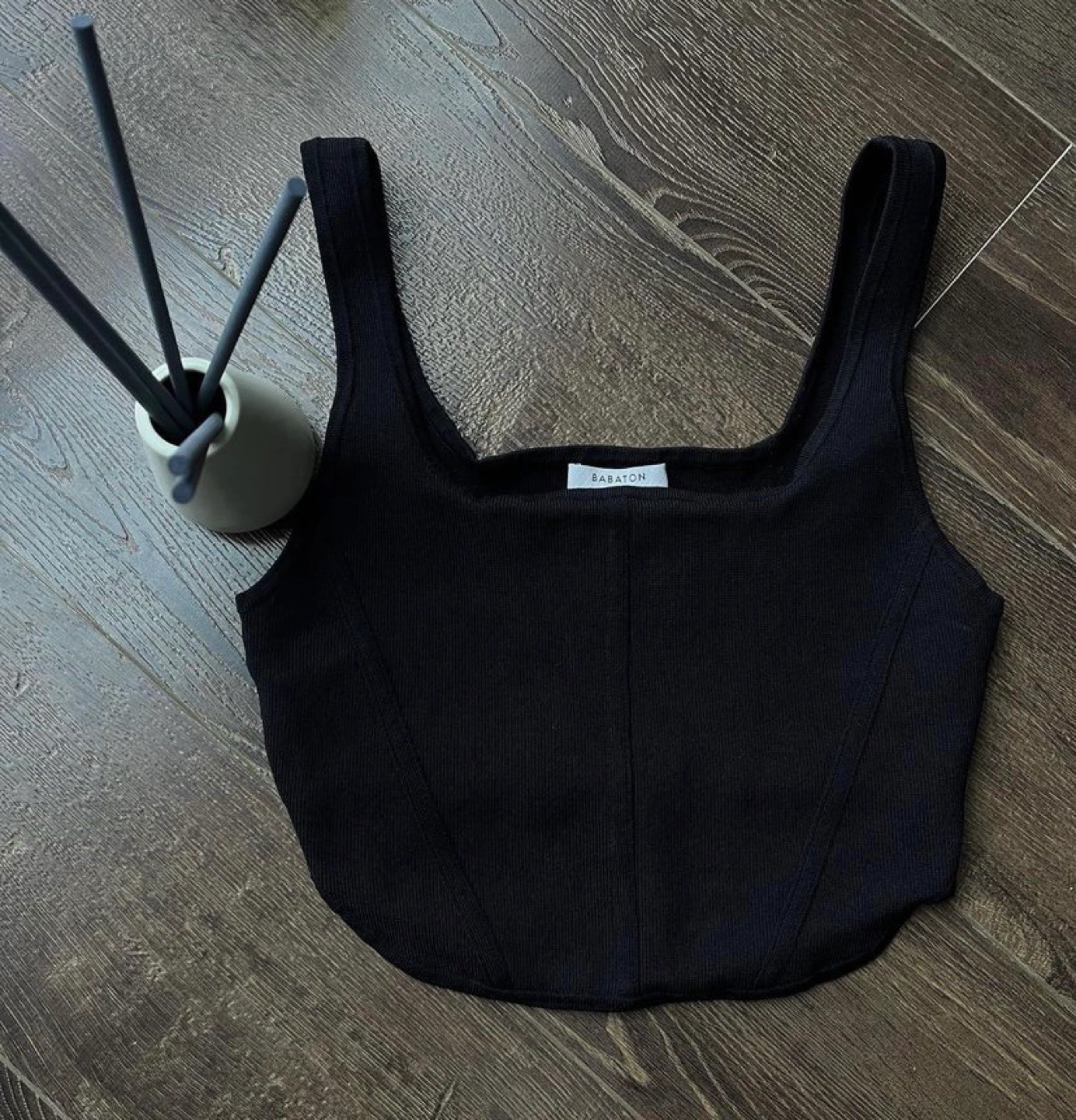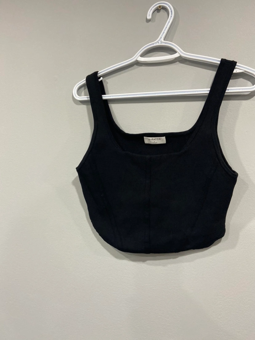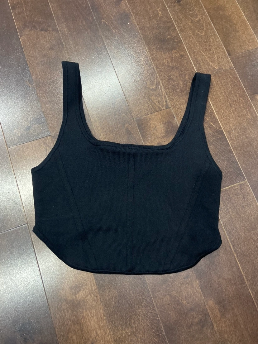 Black ribbed corset top. Sleeveless, with a square neckline and a fitted, cropped silhouette. Made by Aritzia. Babaton black corset style top from Aritizia in a size large. Excellent condition. Thick material. Can fit medium if you have a bigger chest.