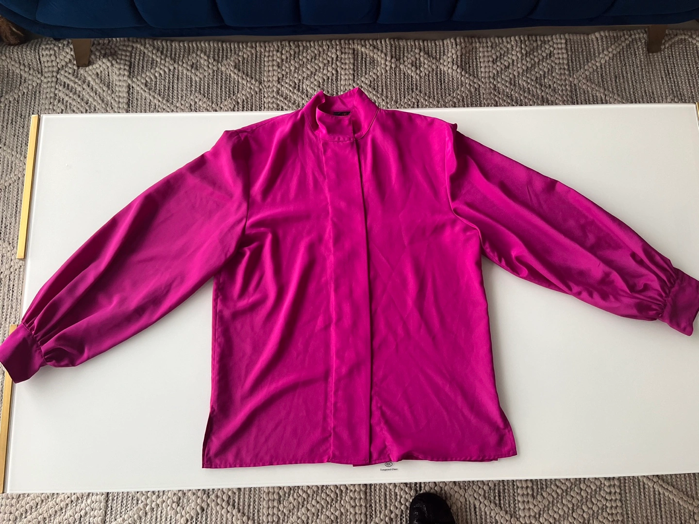 10Long sleeve, mock neck blouse in magenta. Has a button up front.