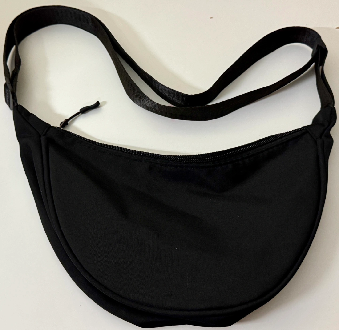 A small black shoulder bag with a zipper closure. The strap is adjustable and can be worn across the body or on the shoulder. The bag has a single internal pocket.