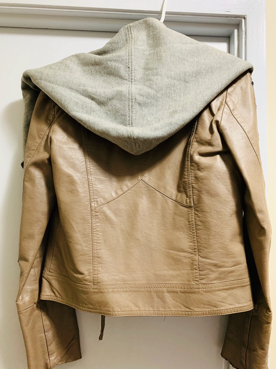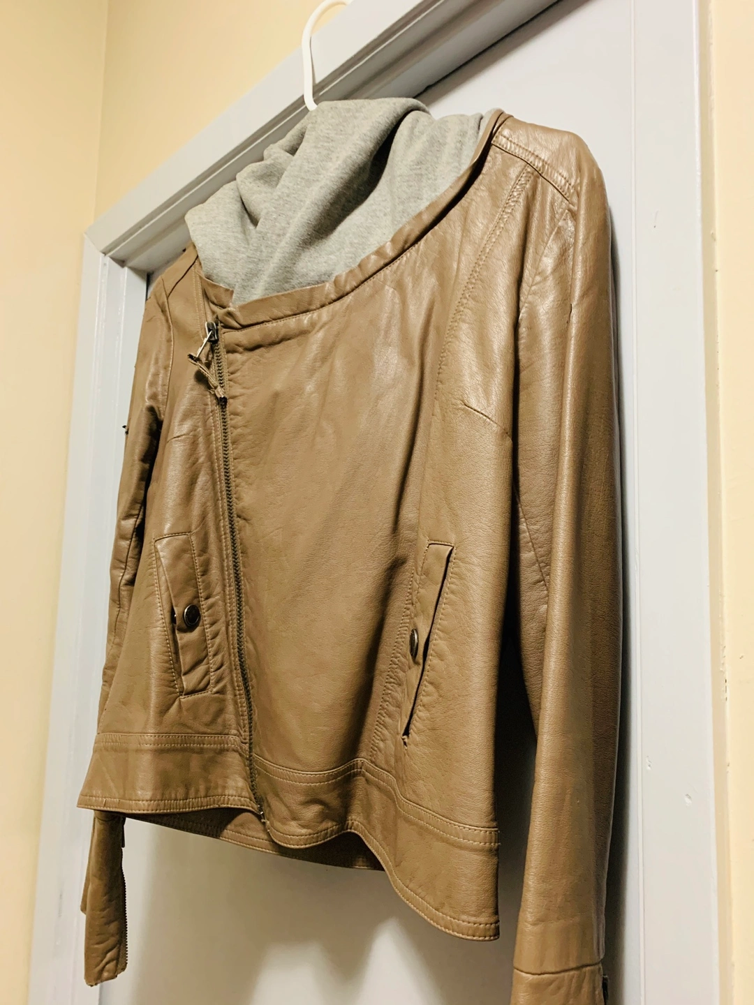 51Tan leather jacket with a grey hoodie. The jacket features a zipper closure, two front pockets, and a cinched waist.