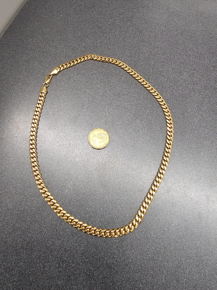 This necklace features a gold chain with a lobster claw clasp. It is in good condition.