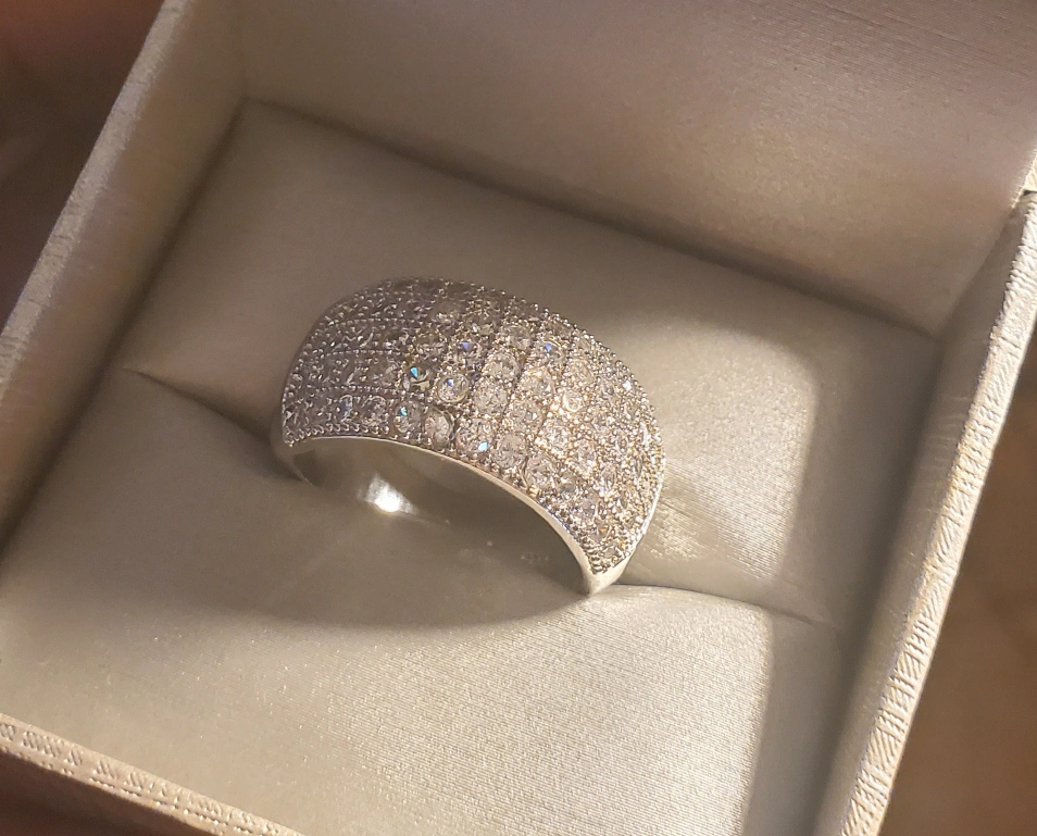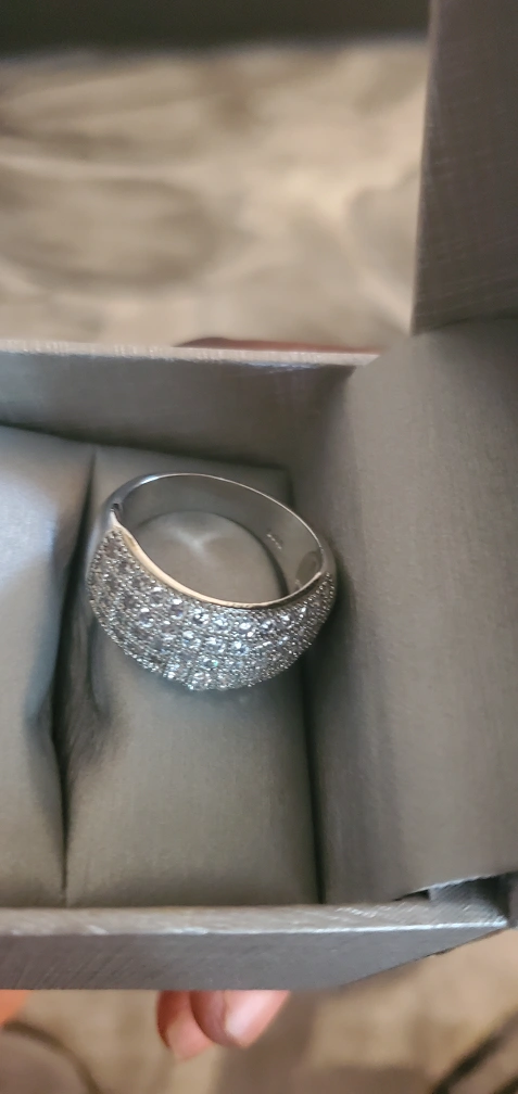 This is a beautiful ring with silver band and many small clear stones around it. It is in its original box.