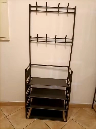 This 4-tier shoe rack with coat hooks is a great way to organize your entryway. It has eight hooks for coats, hats, bags, and more, and four shelves for shoes. It is made of steel and is easy to assemble. The rack measures 60cm wide, 25cm deep, and 152cm high. It is in great condition and comes with all original parts.