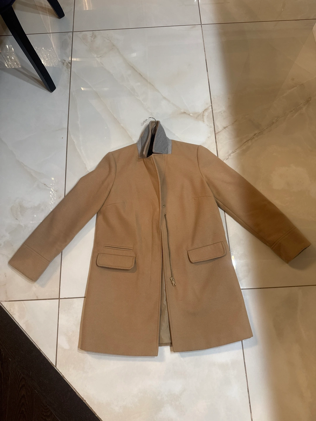 A camel-coloured coat with a grey collar and a zipper closure. It has two pockets. This is a great option for the colder months!