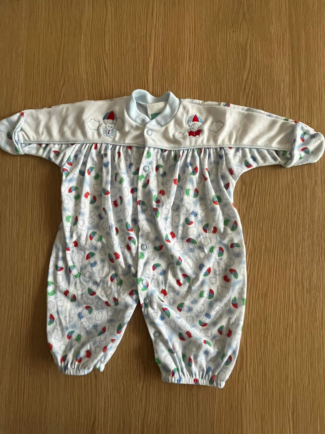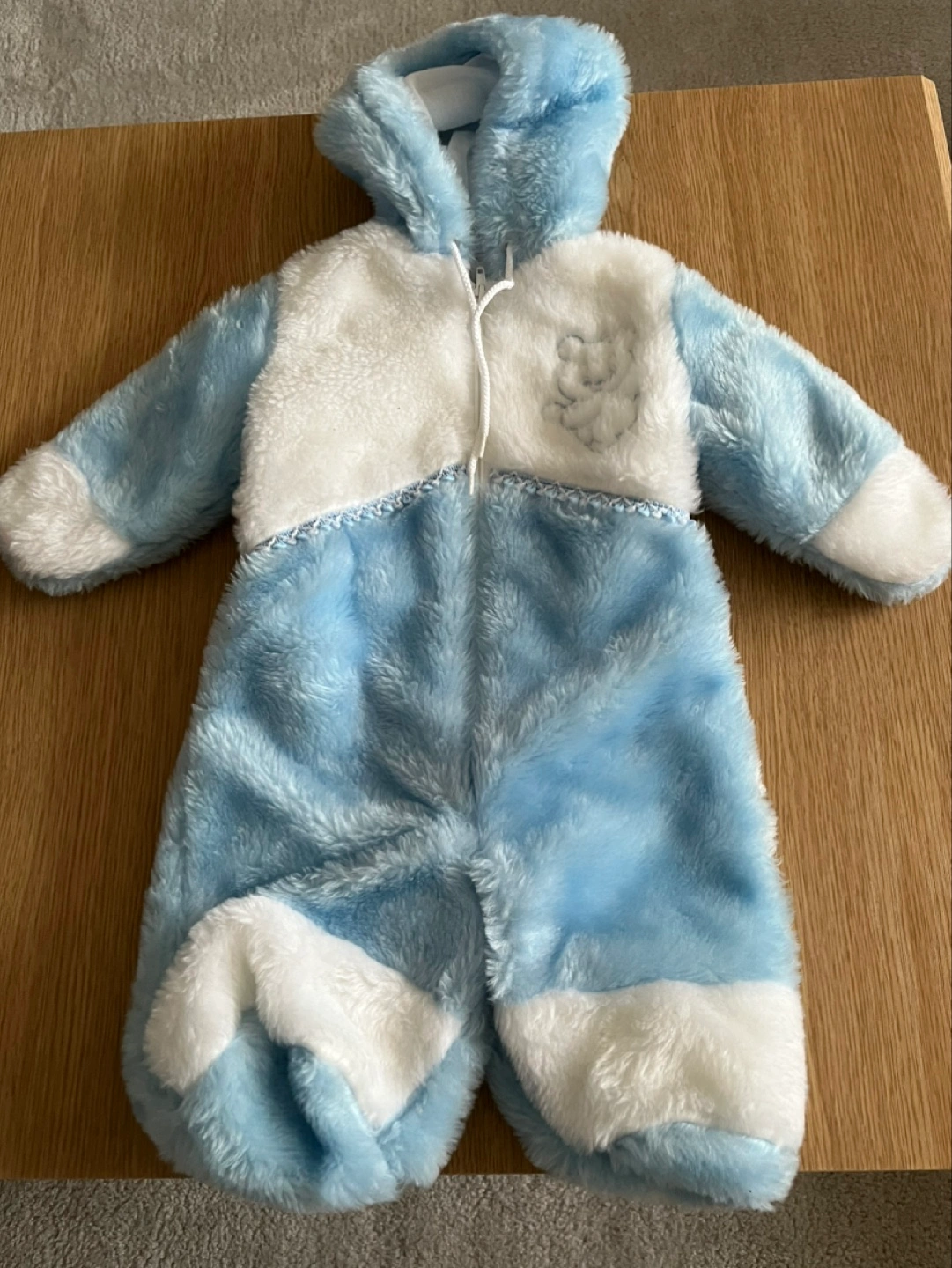 This is a new two piece baby outfit. One piece is a blue and white fuzzy snowsuit with a hood and foot closure. Made in Canada. The other piece is a blue, red and white long sleeve onesie with a bear print on the front. One size fits newborn. Made in USA.