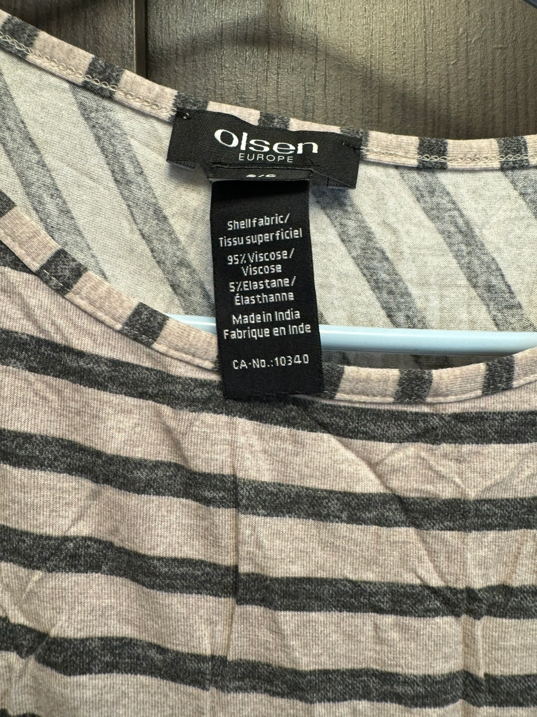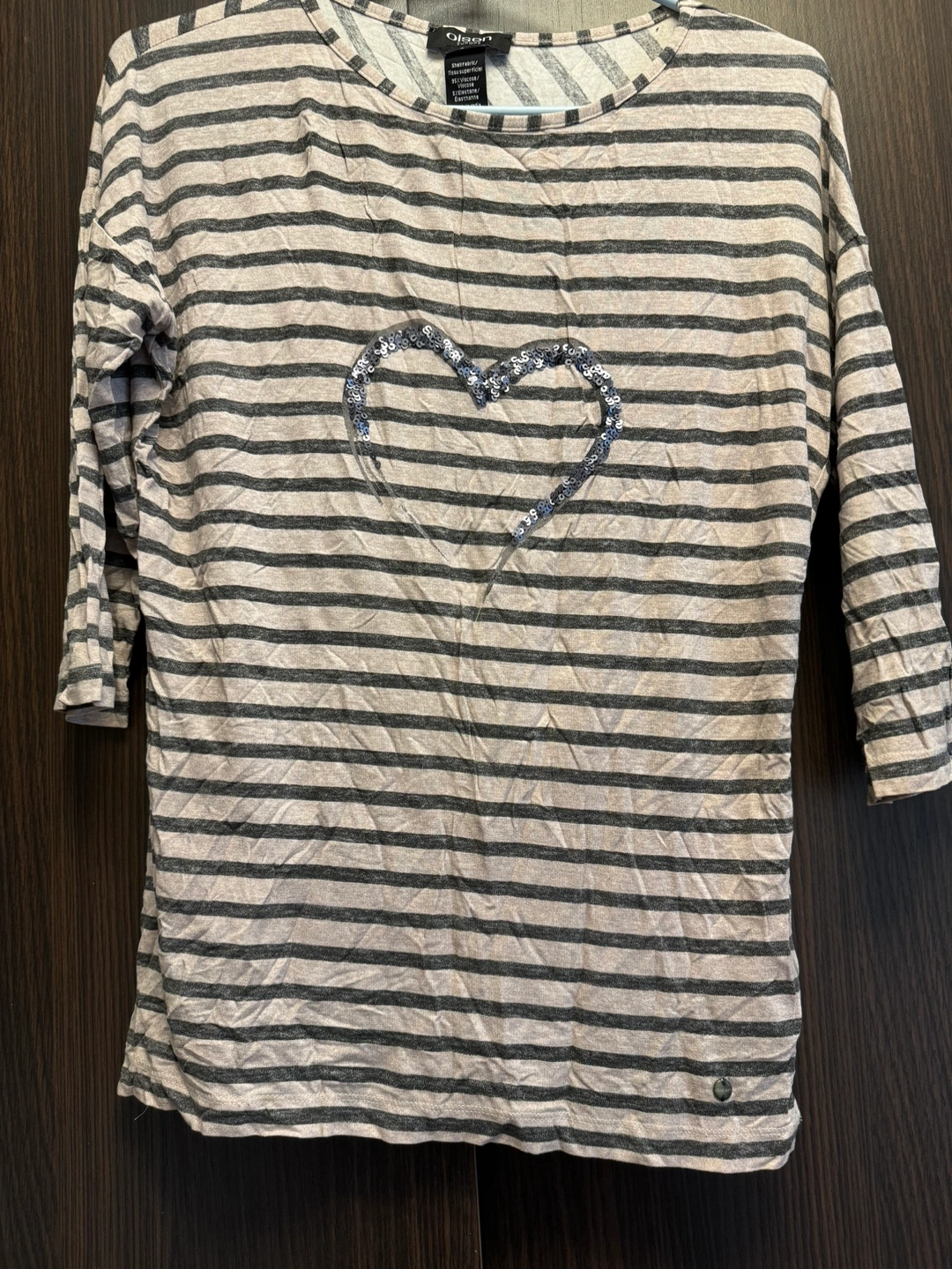 104Grey and white striped top with three quarter sleeves and a sequined heart on the front.