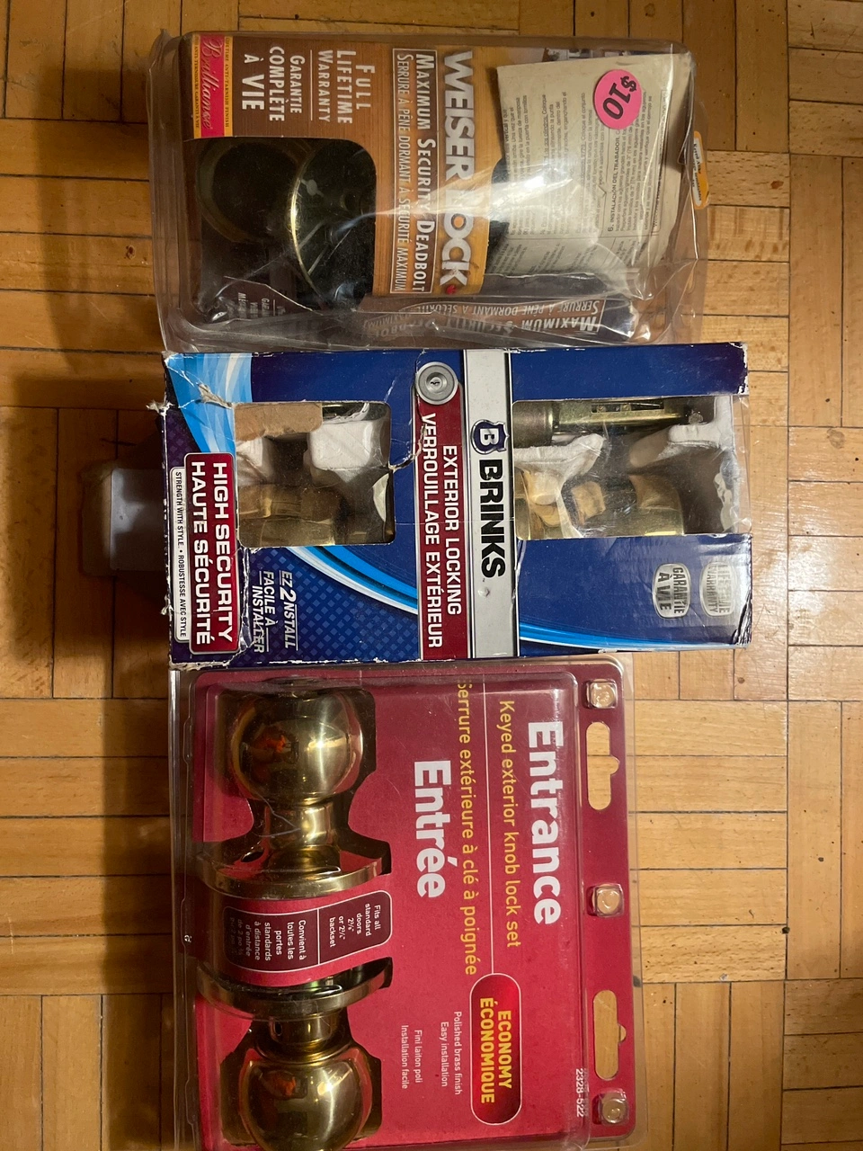 Three door knobs with matching hardware / keys , All new / used ($) packaging. One Weiser lock, one Brinks lock and one no-name brand lock, other indoor handles with doors πͺ or not , many items for cheaper bulk buy if you want make a wish List and we can have ready to view/ but otherwise NO time consuming people allowed without specific wish LiST / ready to get great π deals , be the 1 st to get you pick of treasures and you could also WiN π give away draw prizes including prizes for fastest / best buyer / bulk buyers to remove bigger items like furniture , Bikes , portable TV with VCR movies πΏ / DVD CDs & electronic players / collector records ( Beatles Abby road !) , beds, dressers , cloths new & used , Boots shoes π ππ»ββοΈπ²πποΈπΏππ‘π§¦π₯Ύπ₯Ώπ§’βοΈπ©πππ¦Ίπ§₯π₯Όπππππ§³βοΈππ―βοΈπ«π·π₯π΄π₯π½οΈβ½οΈβΎοΈππ₯πΈβ³οΈπ£πͺπ€Ώπ₯βΈοΈπ₯πΌπΏβ·οΈπβΈοΈβ·οΈππ»ββοΈπ§π΄ββοΈπ΄π΅π»ββοΈππ₯½ππΆοΈπΌπ fridge stove