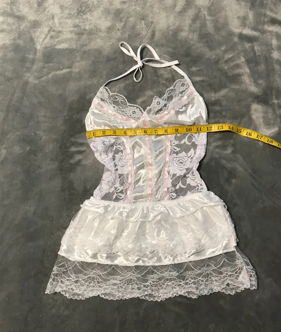 The top part has a halter neck and adjustable straps, while the bottom has a ruffle detail and is open in the back.