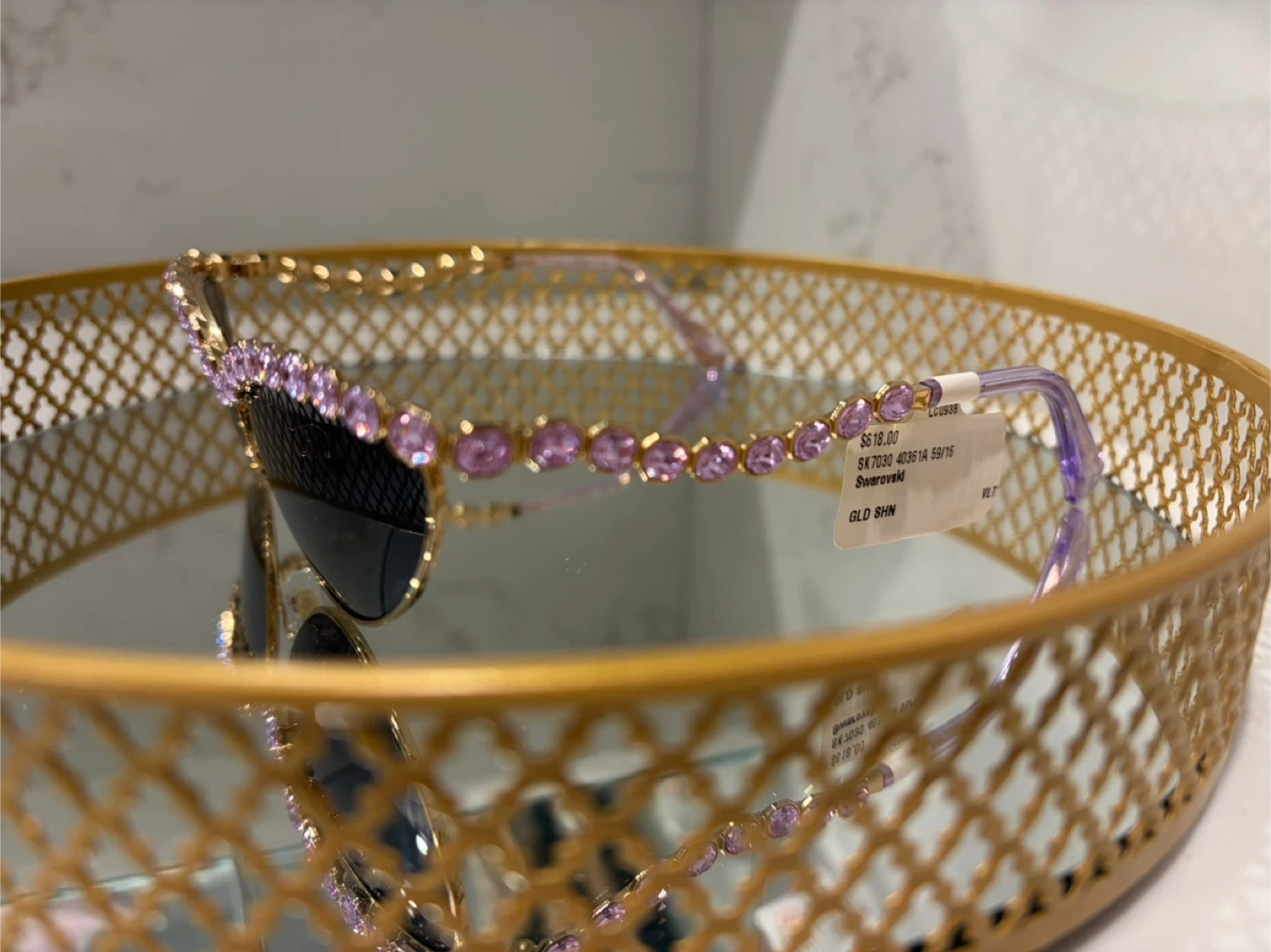 Gorgeous Swarovski sunglasses with a gold shimmer finish. These shades are adorned with sparkling pink crystals along the top and temples. They offer a stylish and eye-catching look for sunny days!