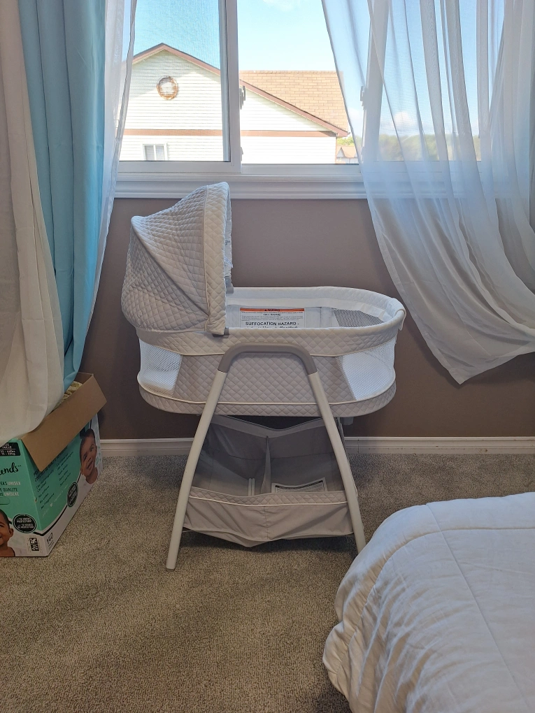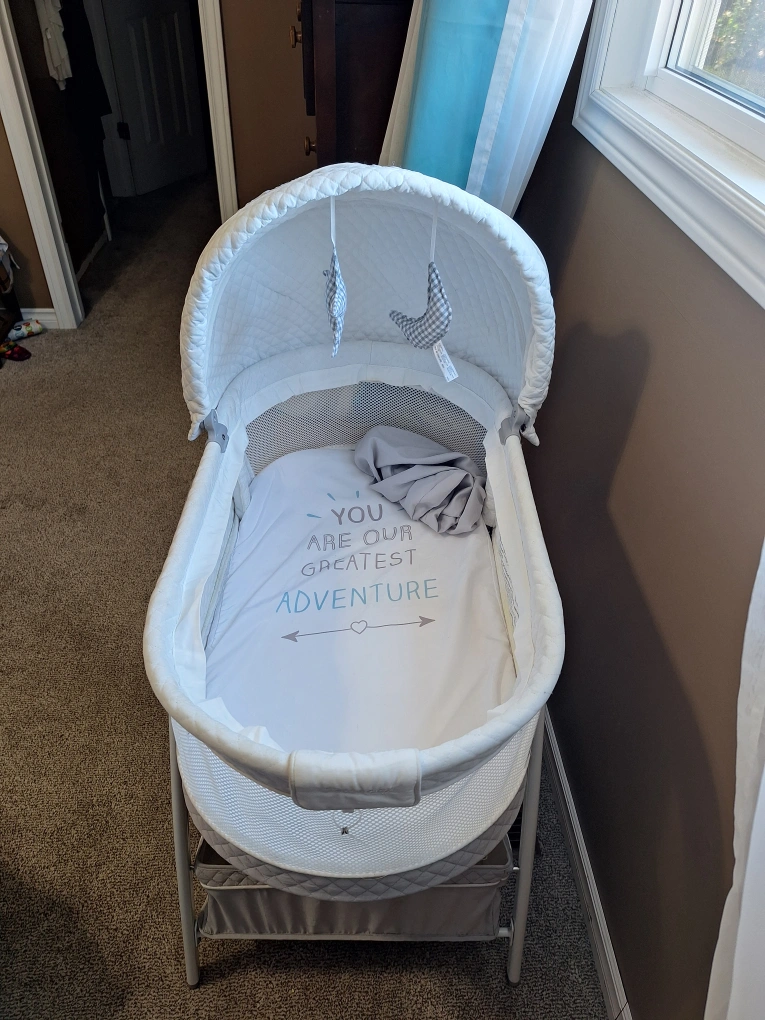 This is an in brand new condition Blissbaby bassinet with a stand. Includes a sound machine and a mattress and 2 fitted sheets. It is in excellent condition. It is great for a baby to sleep in with lots of space. Lots of storage underneath for diapers, wipes, etc also comes with instruction manual.