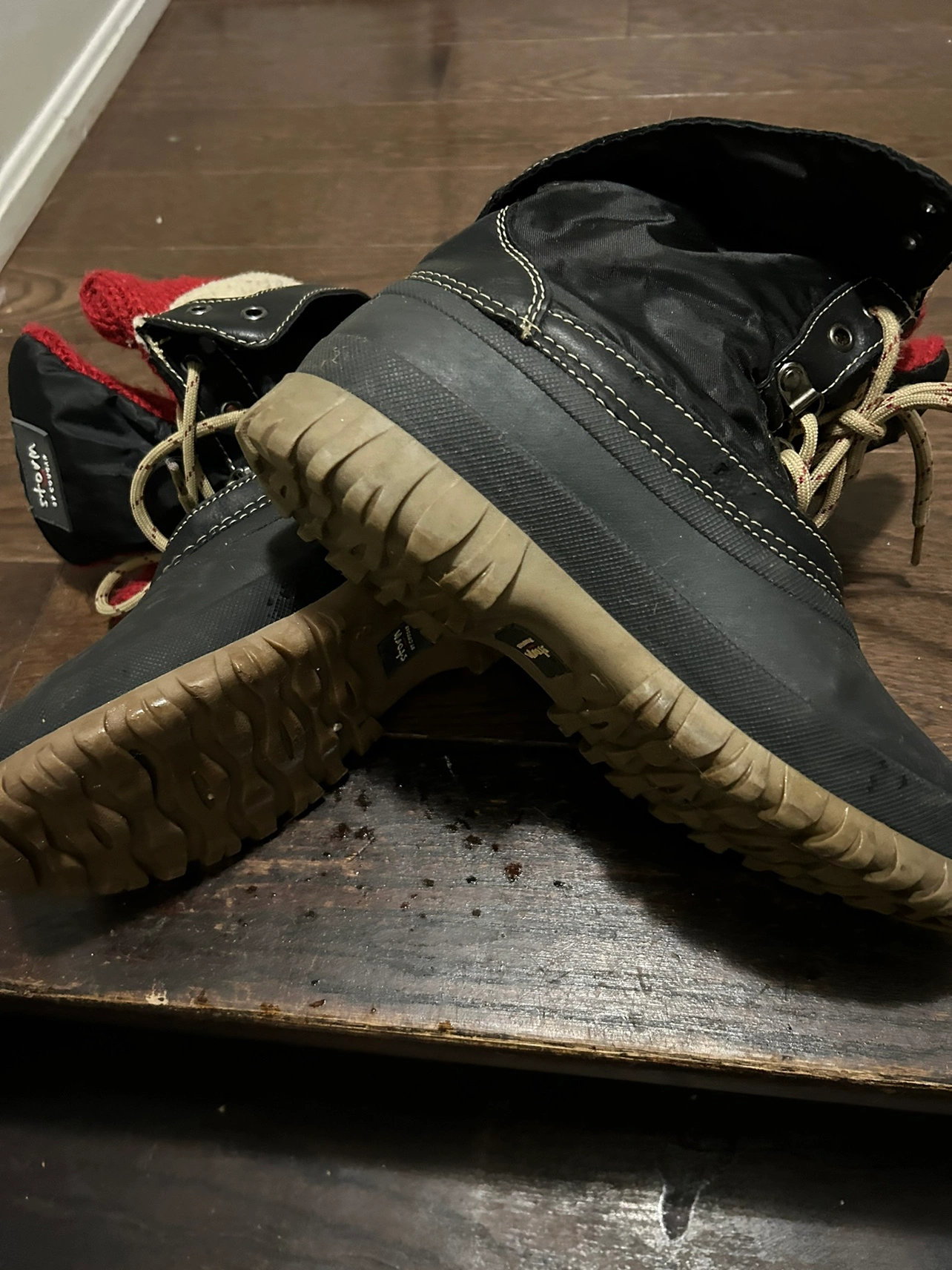 Women's black winter boots with a red and white knit cuff. Lace up design with a rubberized sole. These boots are waterproof and warm.