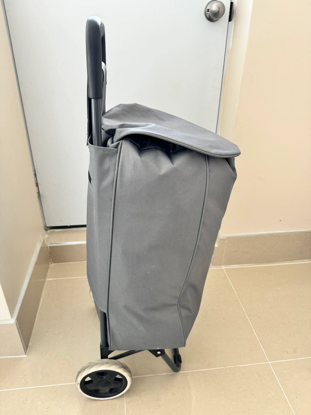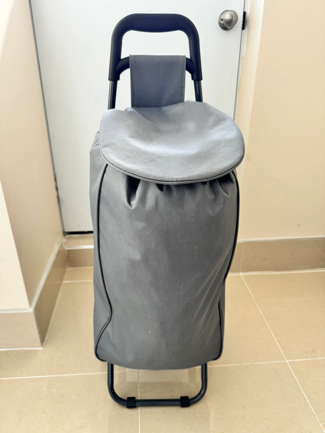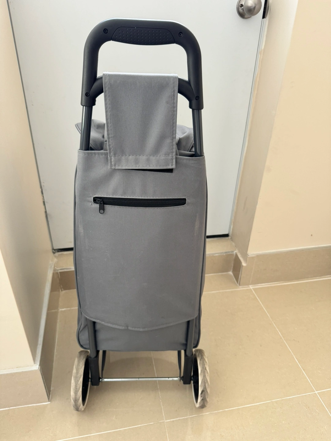 This is a grey shopping cart with a foldable metal frame and wheels. It has a zippered pocket on the back. It can be used for grocery shopping or carrying other items.