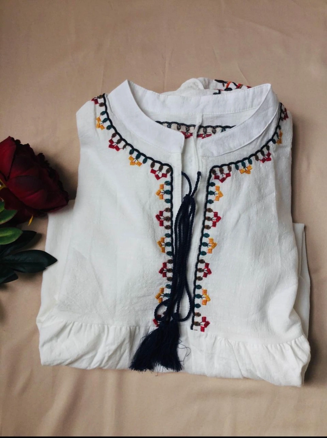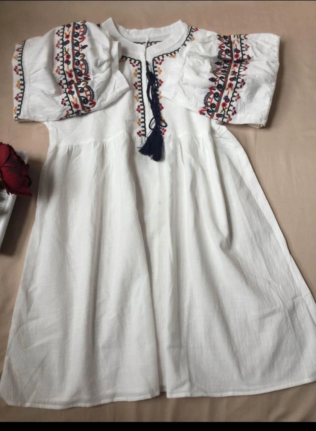 104A beautiful white dress with colourful embroidery and a tassel detail. The dress has a loose, flowing fit and is perfect for casual wear. It has 3/4 length sleeves.