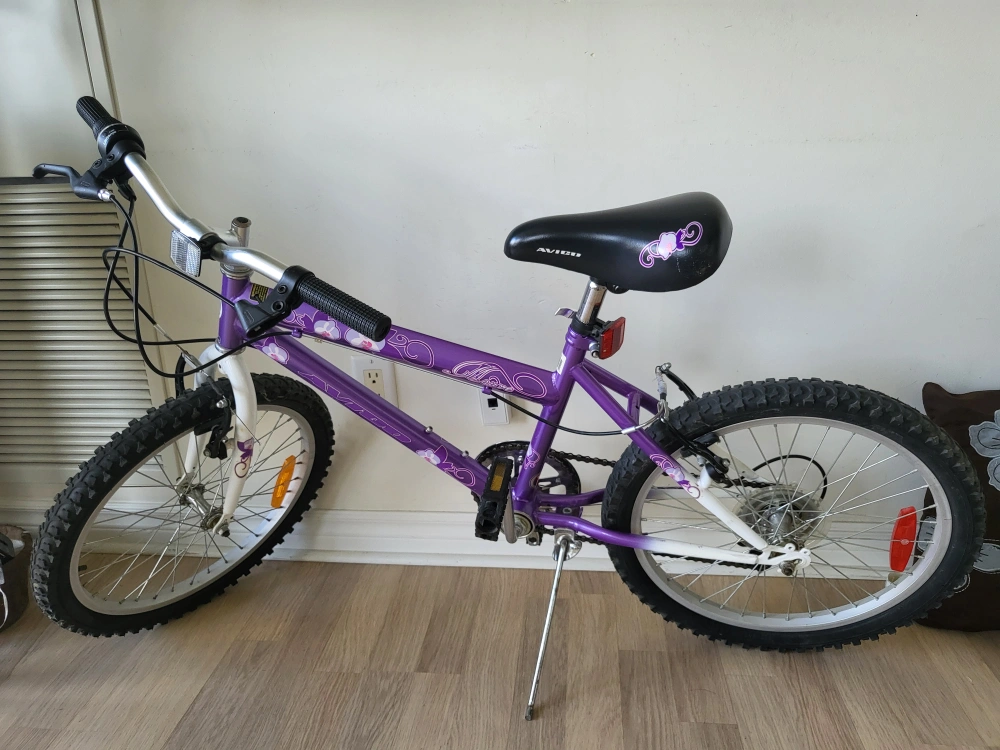 pickup - 700 Humberwood Boulevard etobicoke M9W7J5 Purple and white bike with black wheels. Kickstand included. Seat height is adjustable. I lost a brake handle in the moving. The bike is in excellent condition. No rust or scratches. Hence such a low price, else bike in excellent condition $150