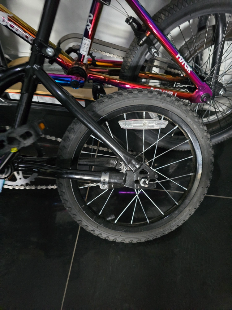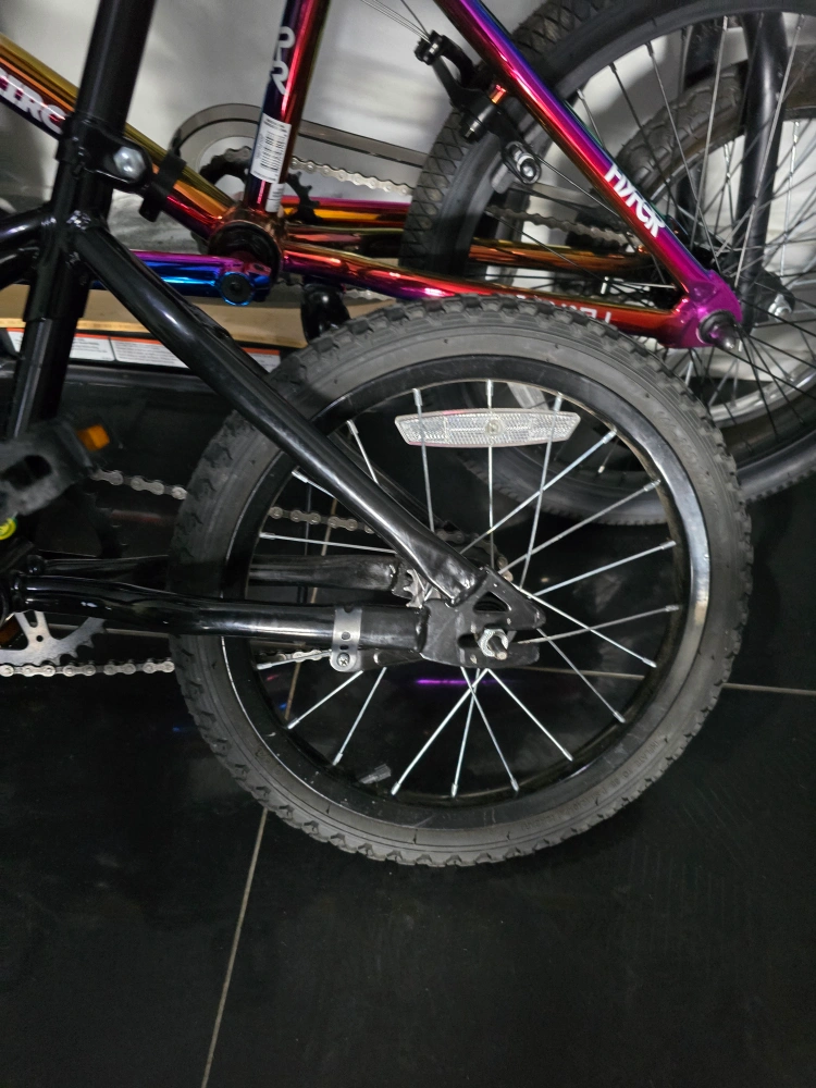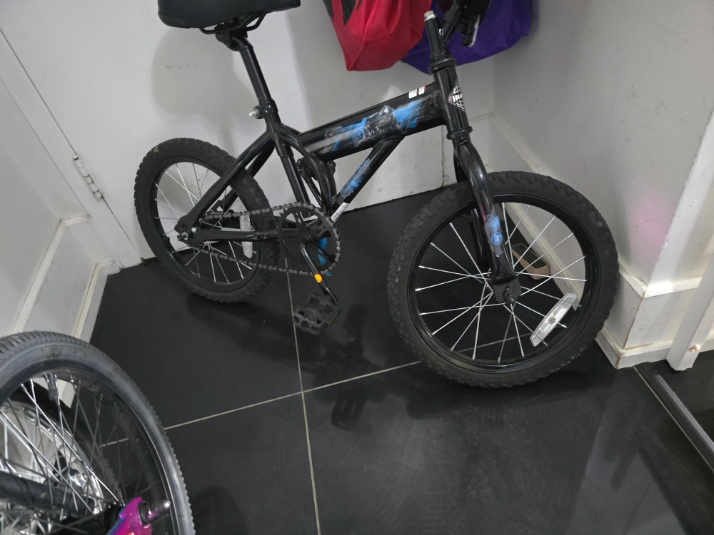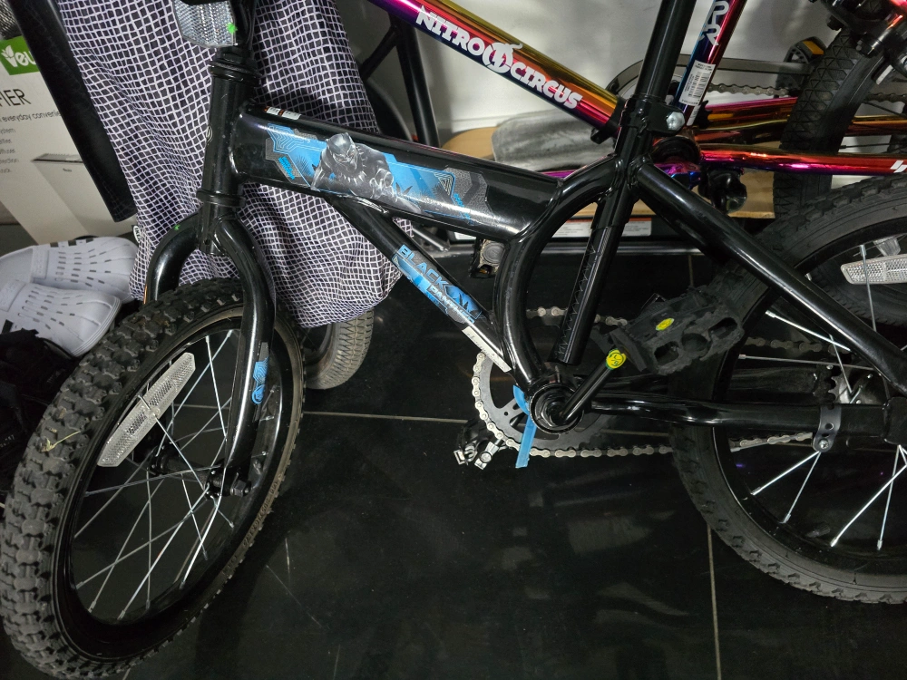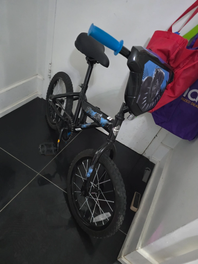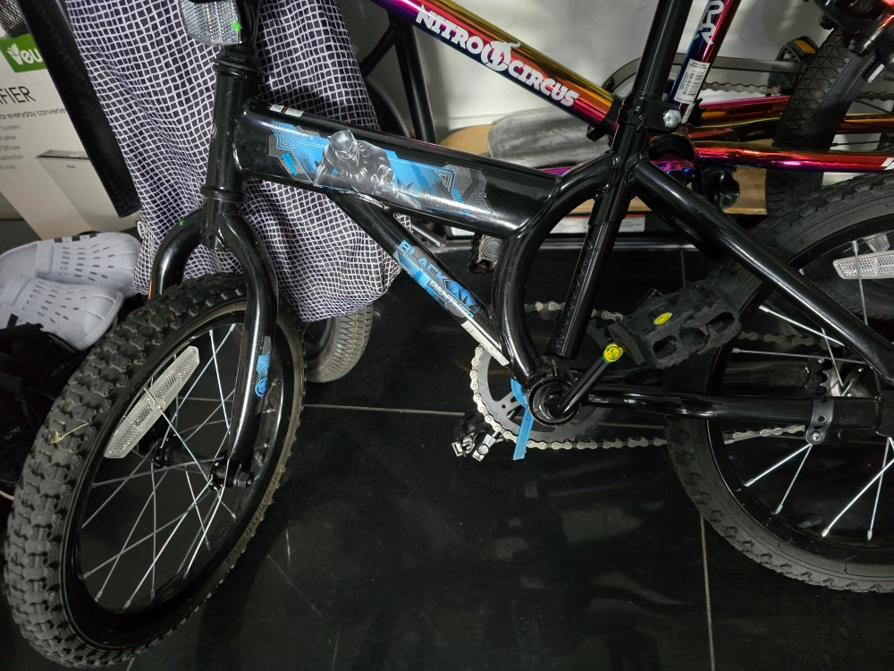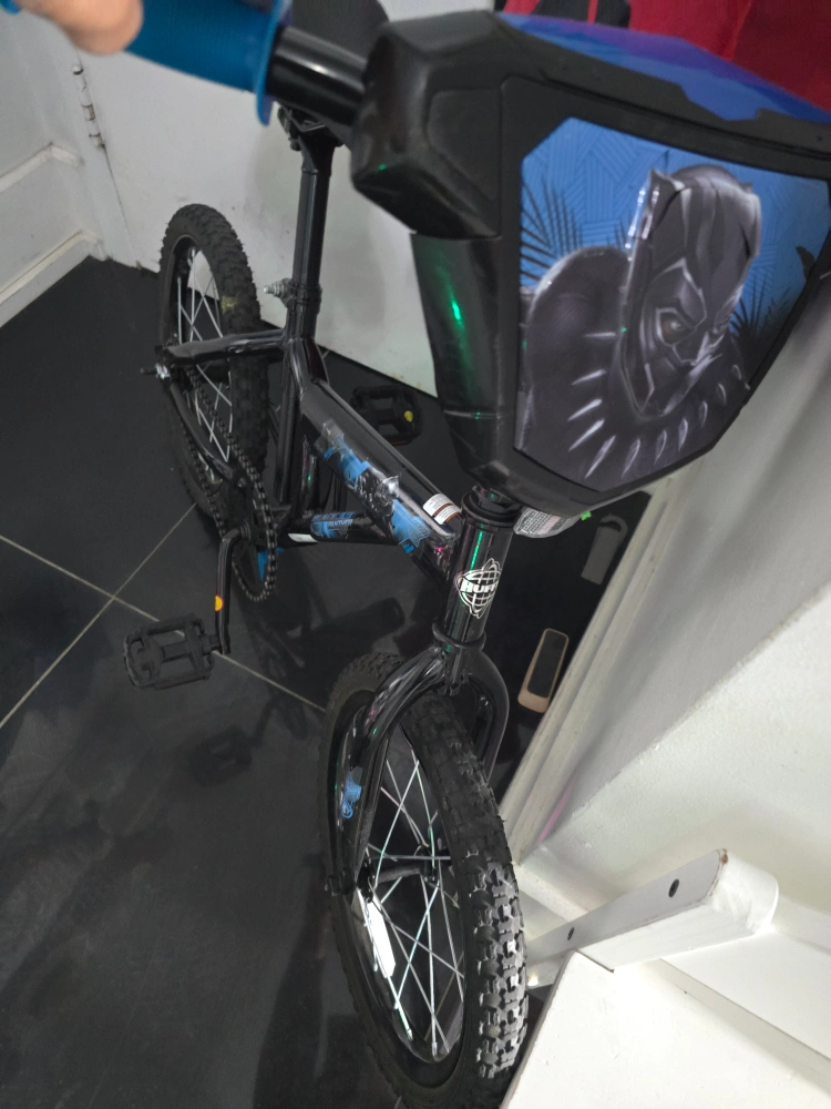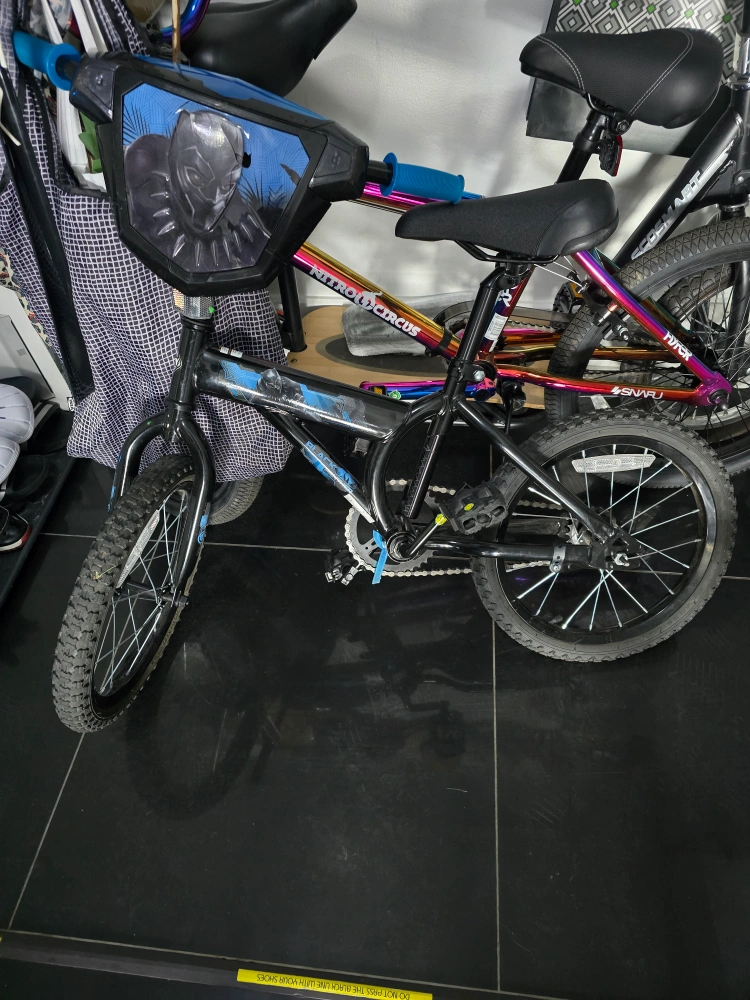 923Black kids bike with Black Panther graphics. If you have training wheels they can be attached. better than Good condition. Tires, chain, upgraded the seat, handle all tight working in perfect order.
