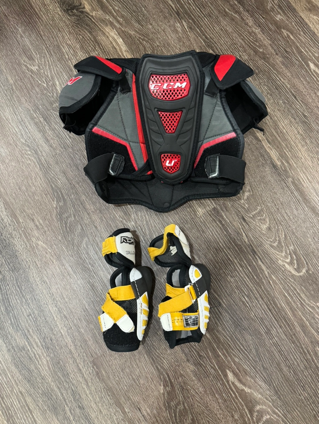 CCM hockey shoulder pads medium and RBK elbow pads, Size 2.(xxs youth)Grey, red, and black shoulder pads with yellow and white elbow pads. Fair condition.
