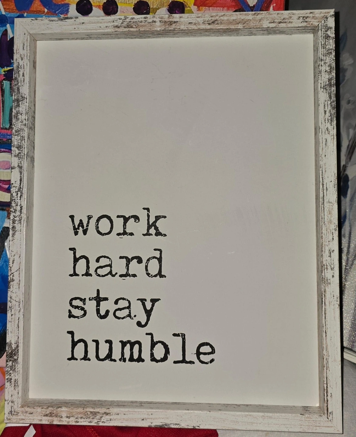 Framed sign with the saying "work hard stay humble" in a typewriter font. White distressed frame.