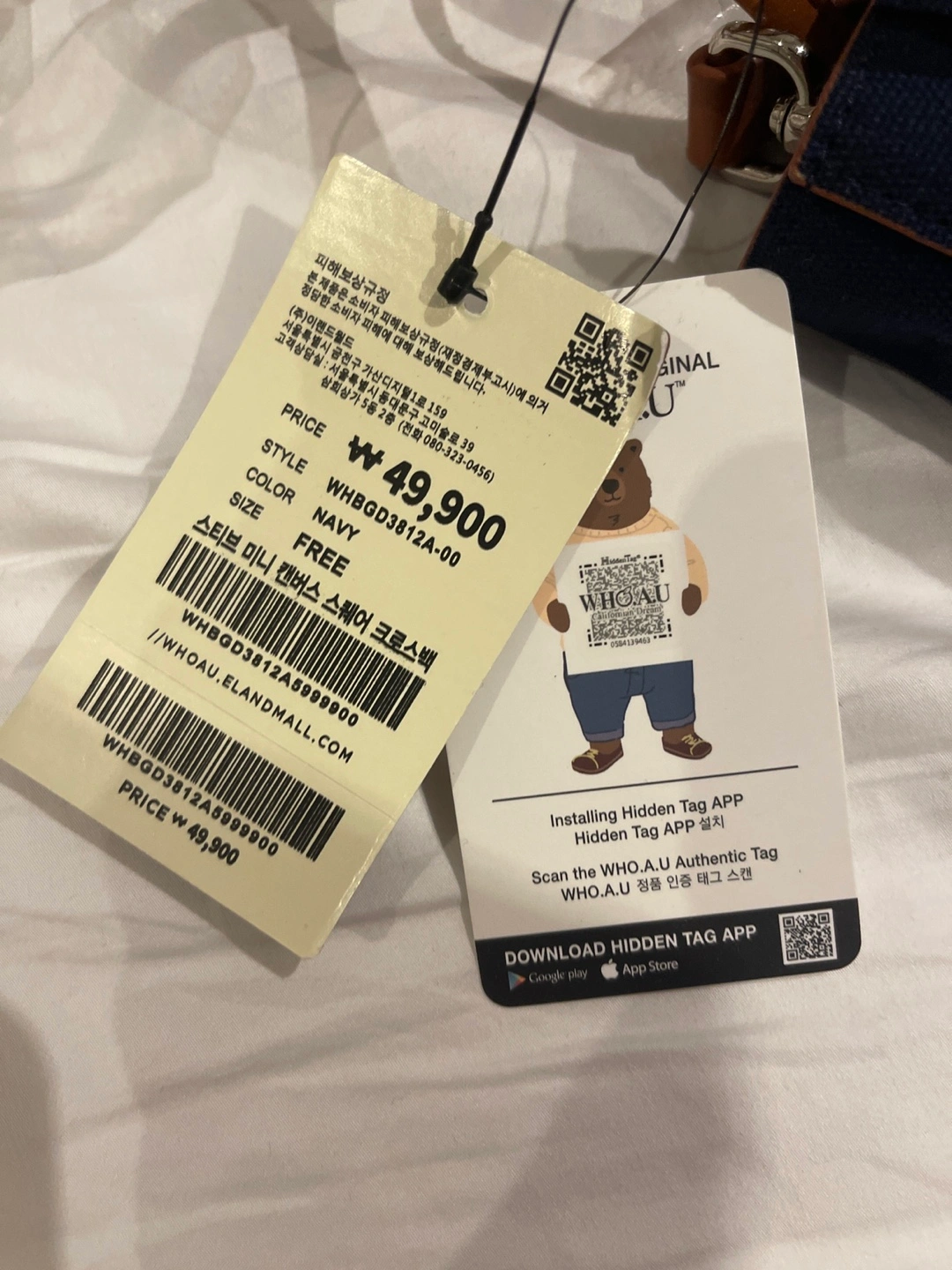 Small navy blue crossbody bag with a brown strap and handle. Has a small embroidered bear on the front. Bought for ₩49900 in Korea, around $50 CAD without tax. BRAND NEW