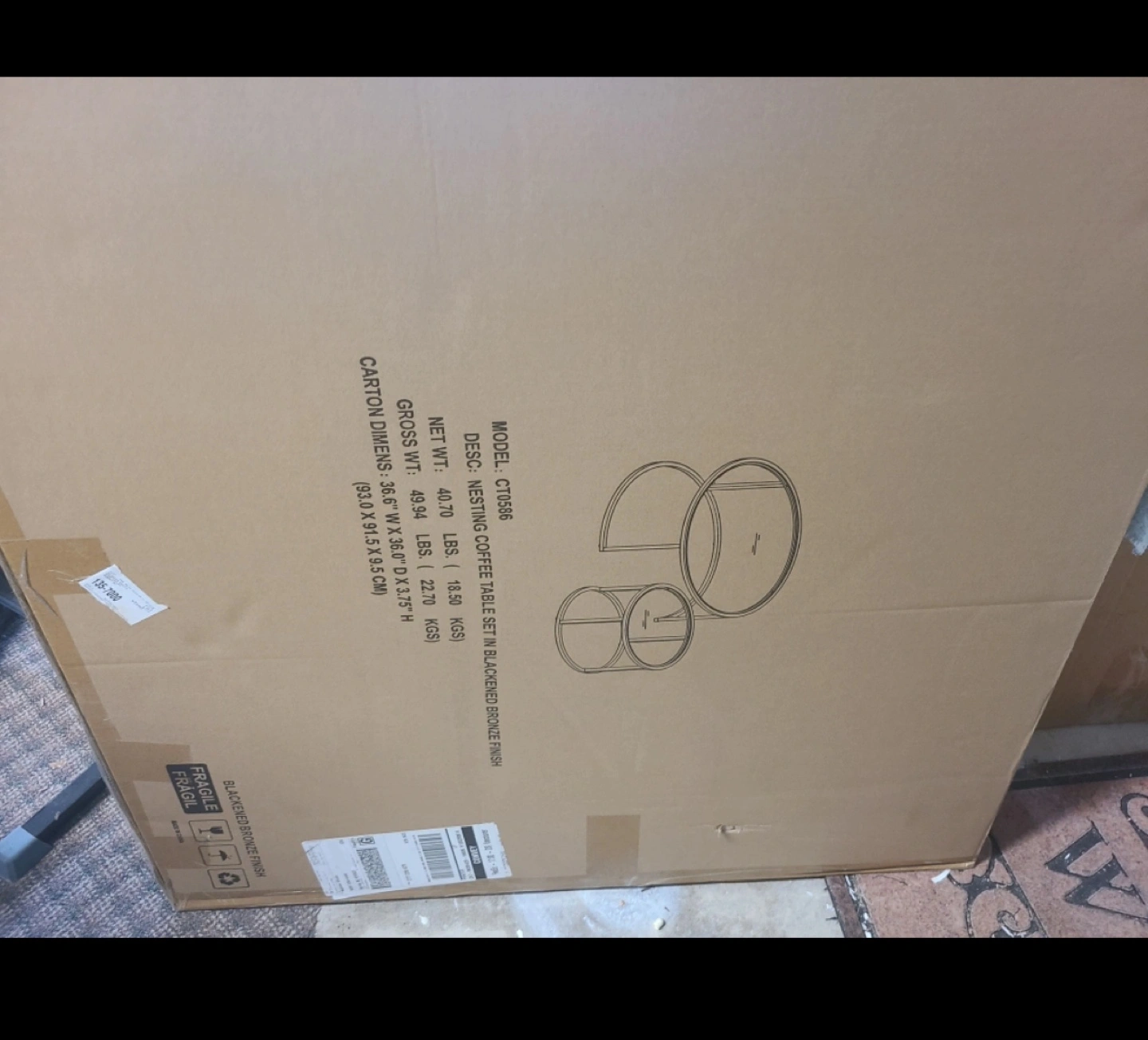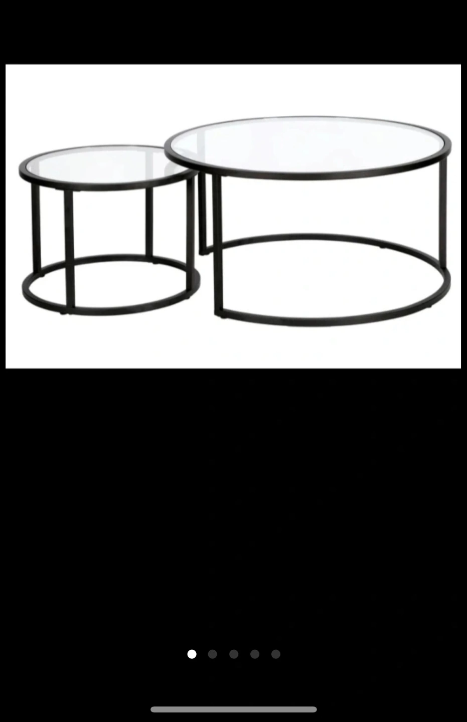 Set of two glass top coffee tables with black metal frames. The smaller table fits inside the larger table for compact storage.