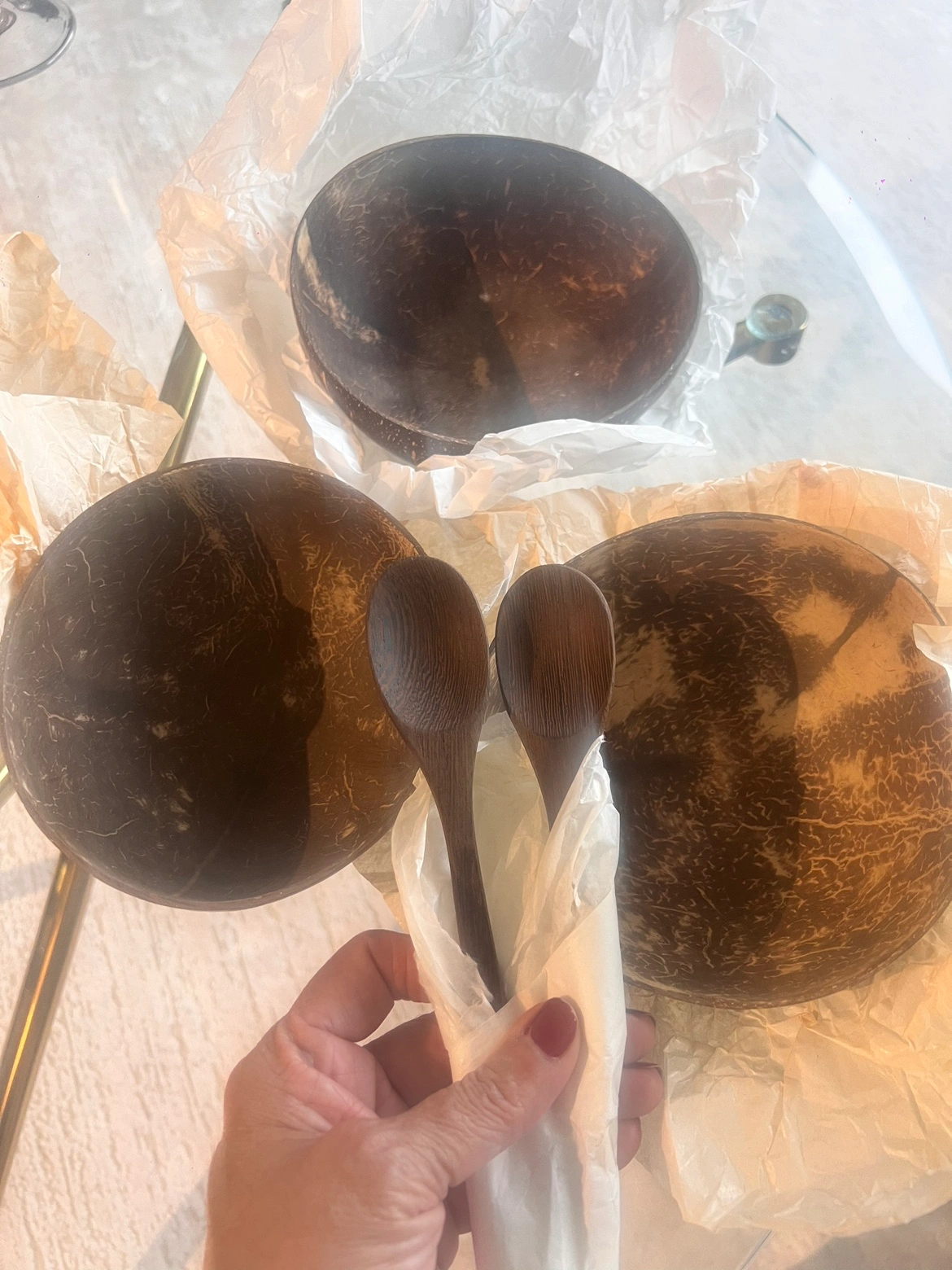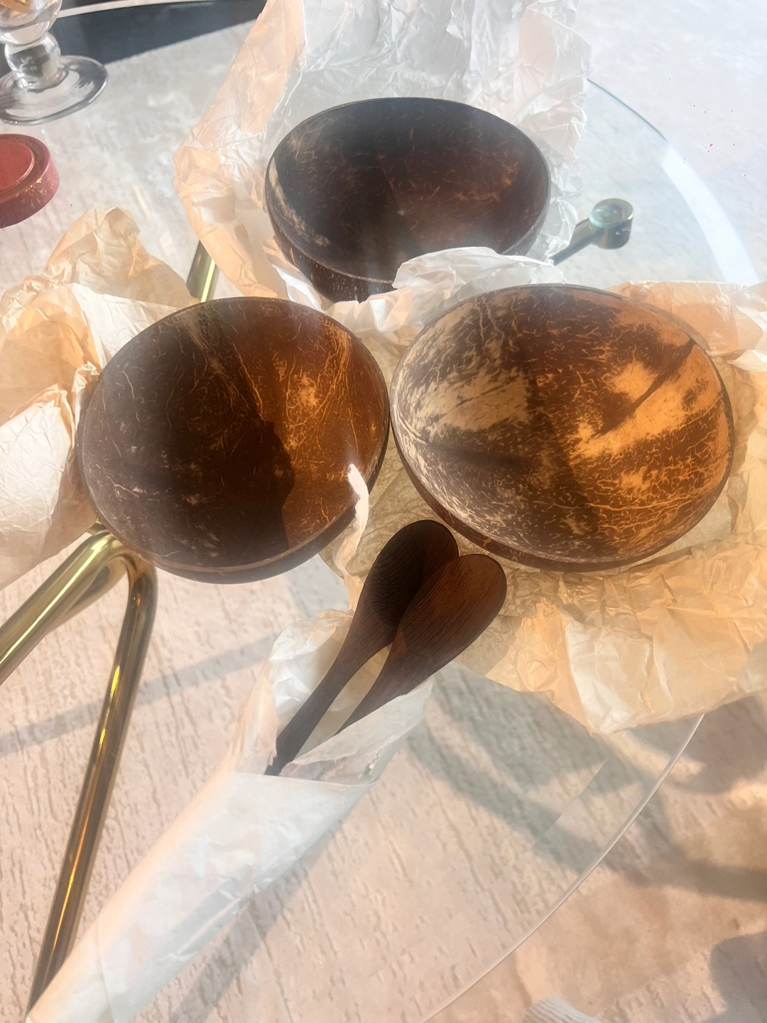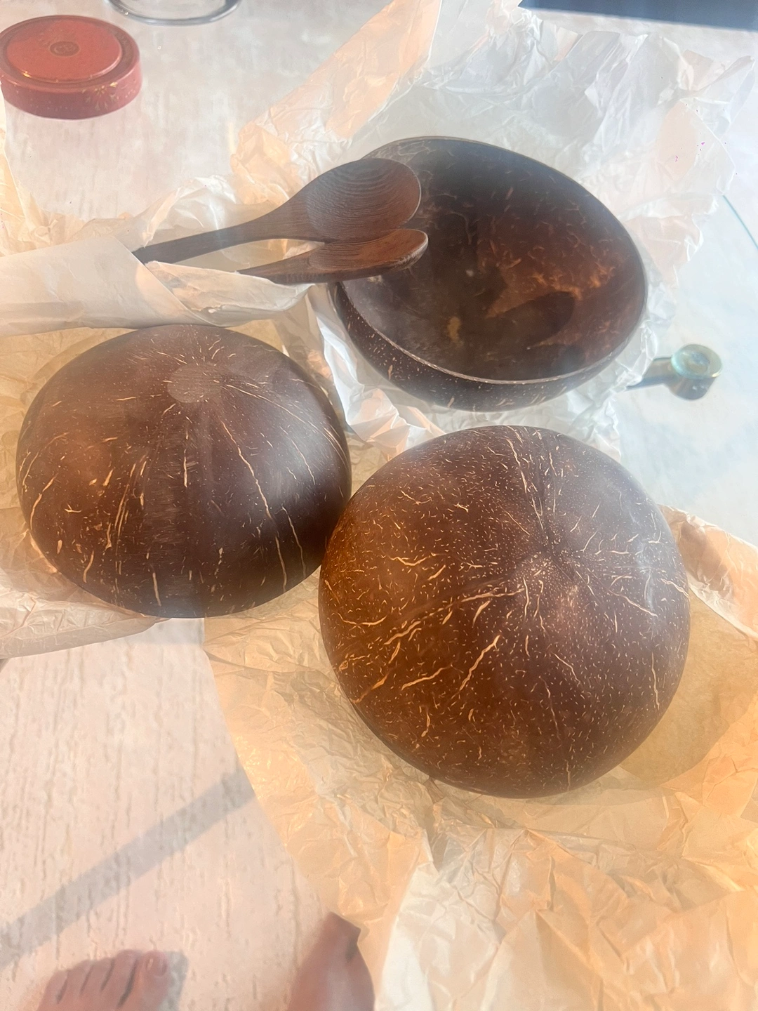 From Brazil 3 coconut bowls with 3 wooden spoons. Perfect for serving Acai bowl , or small meals.