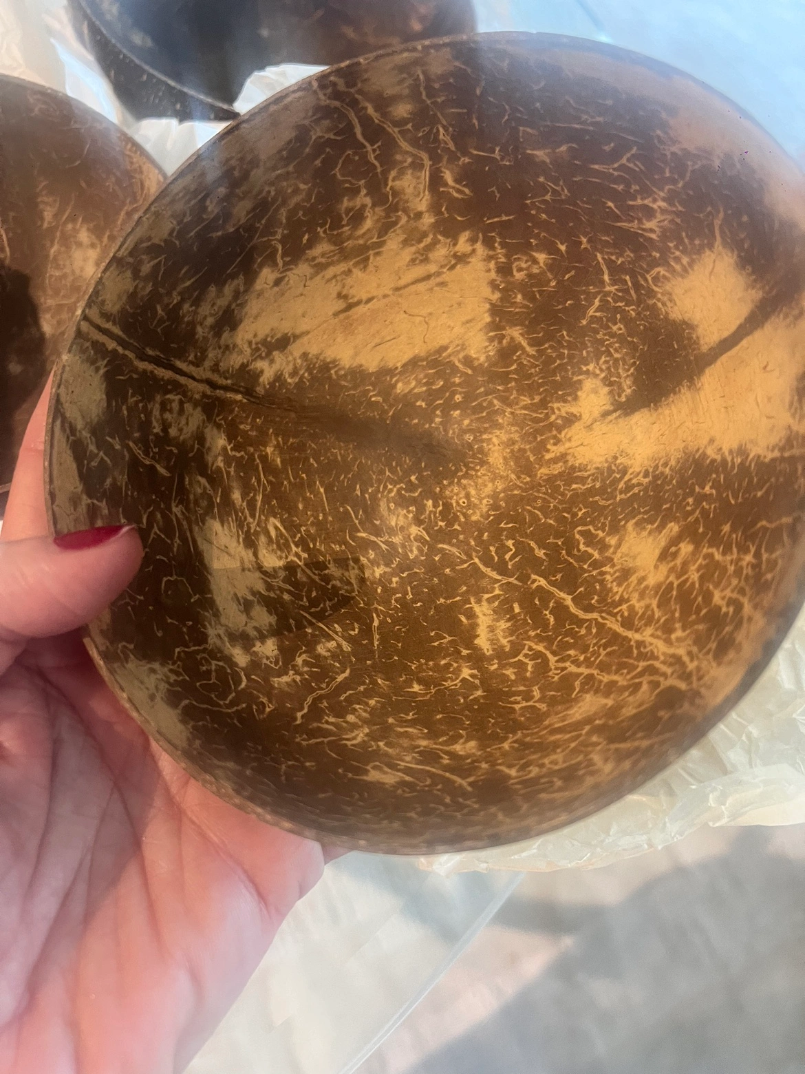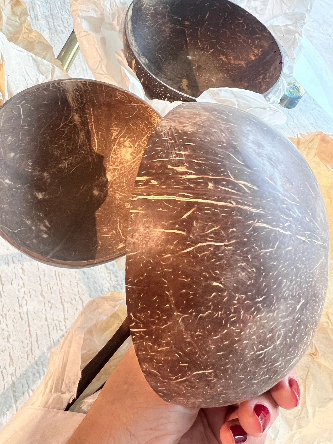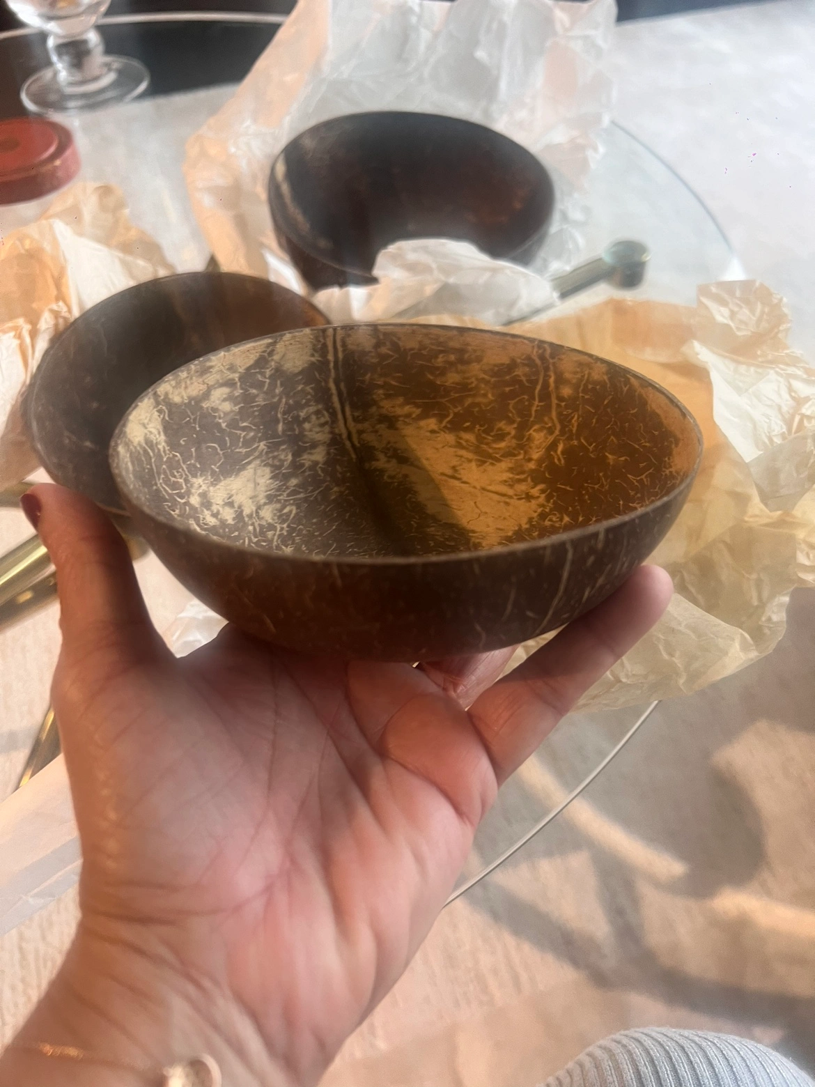 From Brazil 3 coconut bowls with 3 wooden spoons. Perfect for serving Acai bowl , or small meals.