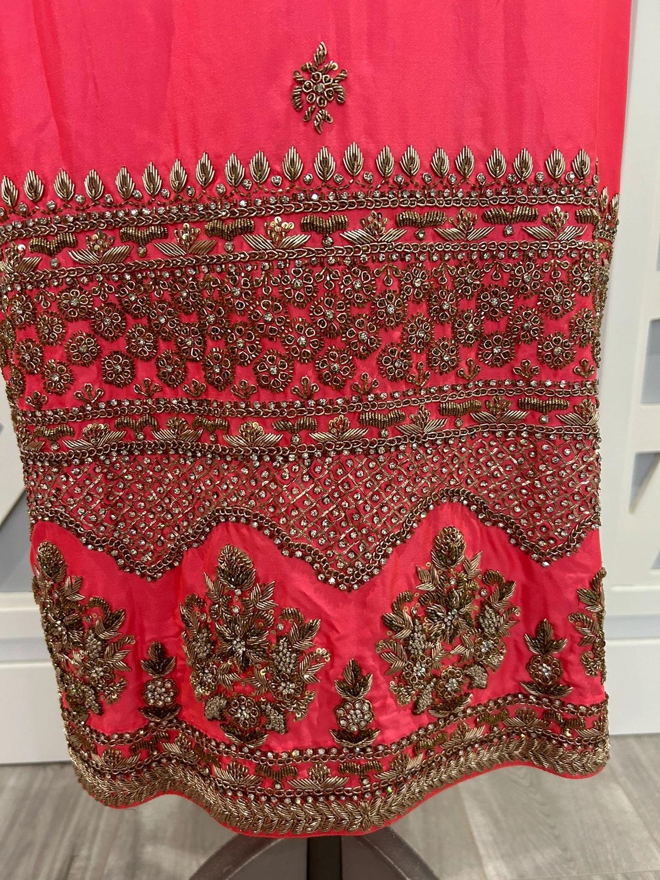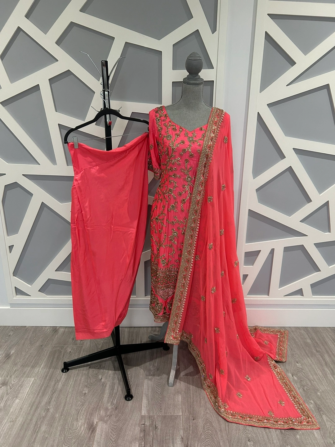 Beautiful pink salwar kameez suit with embroidered detailing. Includes a kameez, salwar, and dupatta.