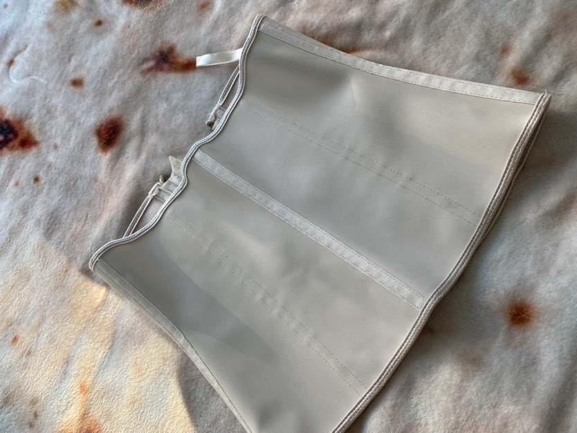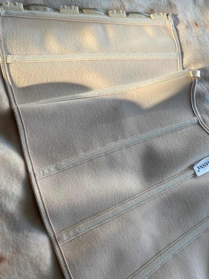 Beige waist trainer with front zipper closure, adjustable hooks, and lace up back.