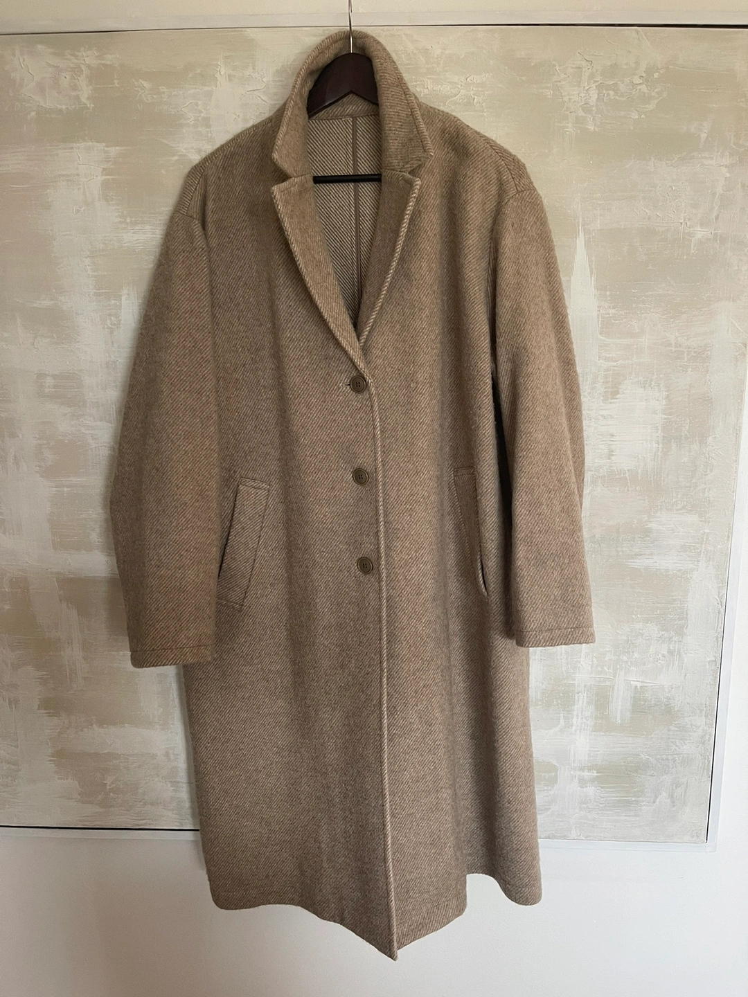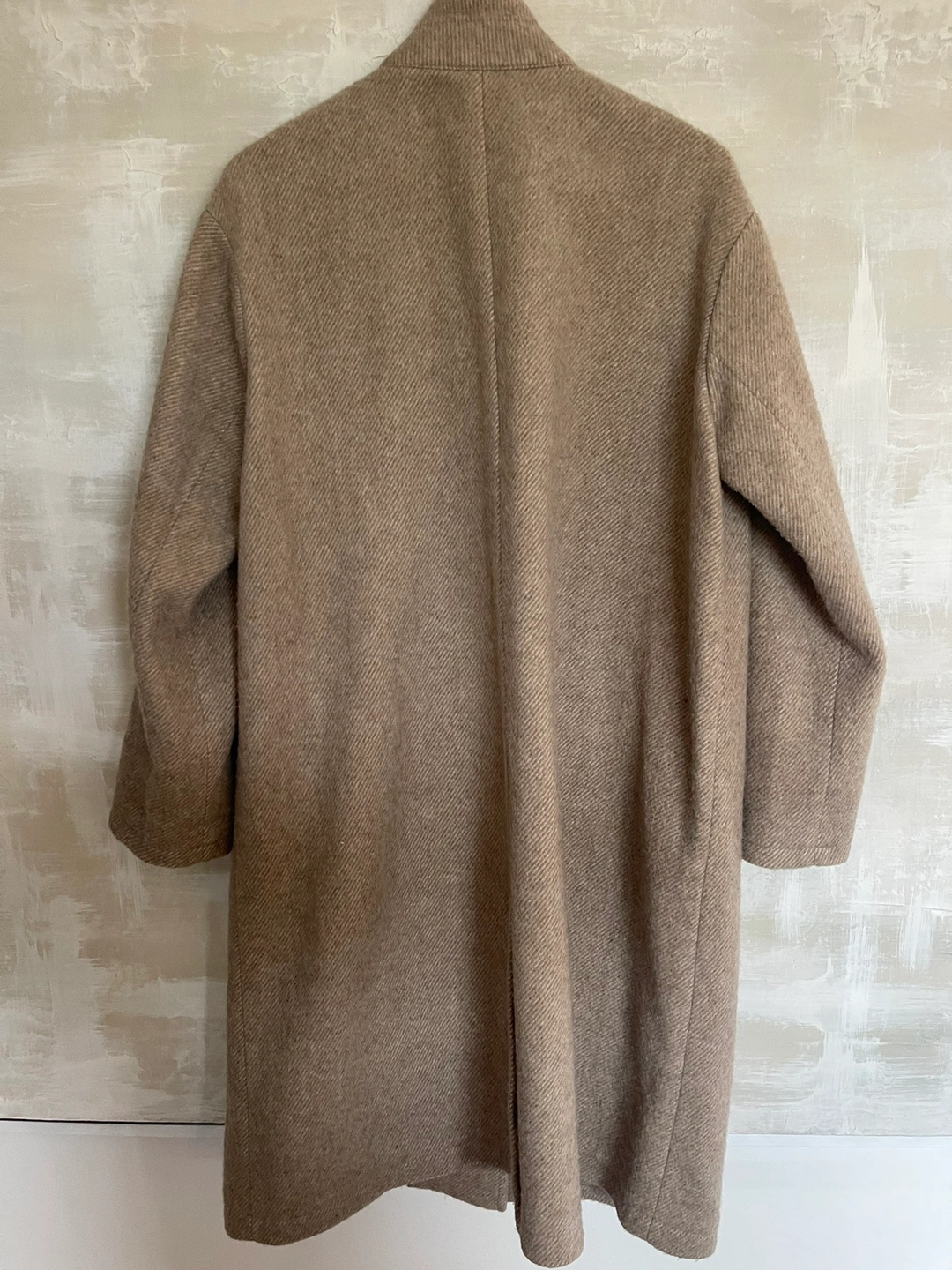 Long coat, neutral beige, stand collar, long sleeves, 2 deep angled pockets, four button closure.