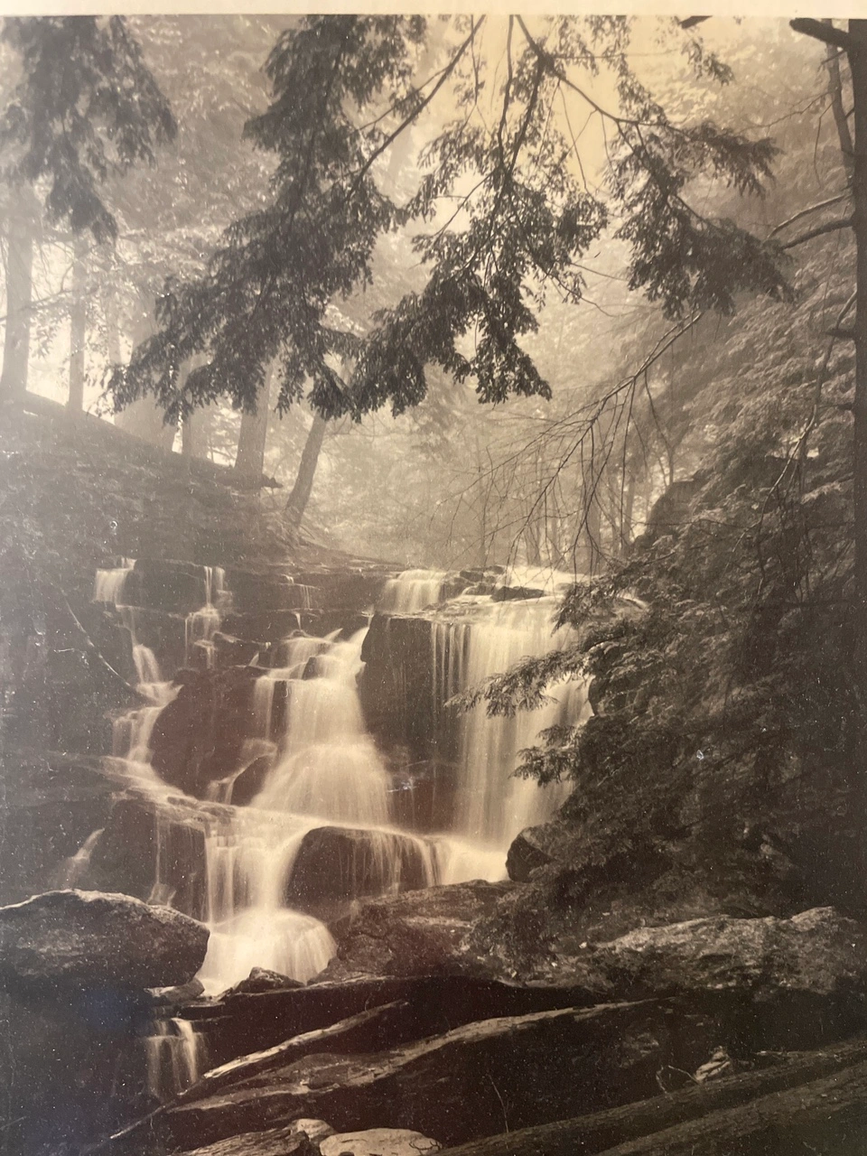 Black and white framed photograph of a waterfall, signed by Russell DeCarlo.