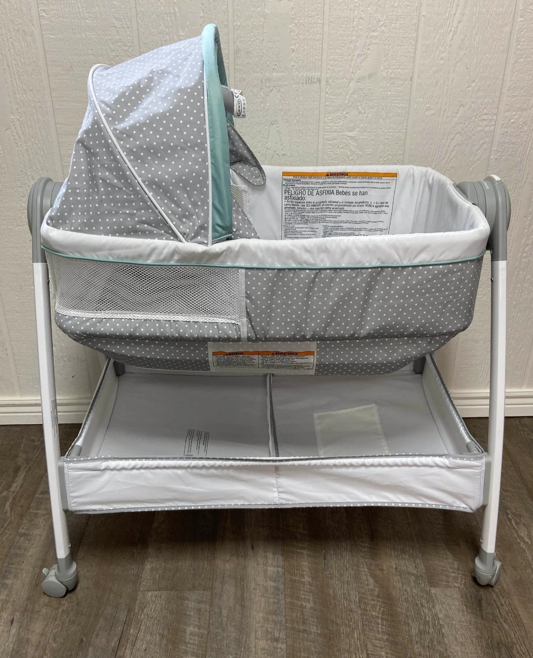 Grey and white bassinet with canopy and storage shelf. Includes a vibration feature. Need some cleaning. Toy not included. Already dissamled.