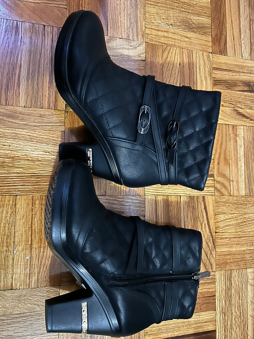 Black quilted ankle boots with a side zipper. Has a thick heel and a buckle detail. Size 6. Wore once.