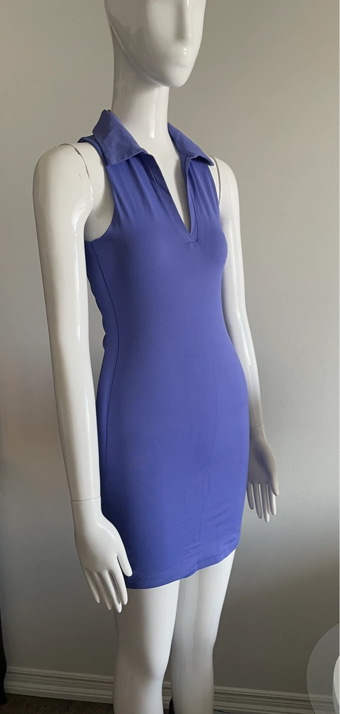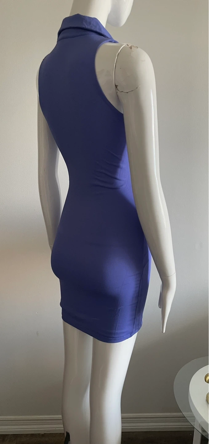 A sleeveless collared mini dress in a vibrant purple hue. It features a v-neckline and a form-fitting silhouette. This dress is perfect for a night out or a casual daytime look!