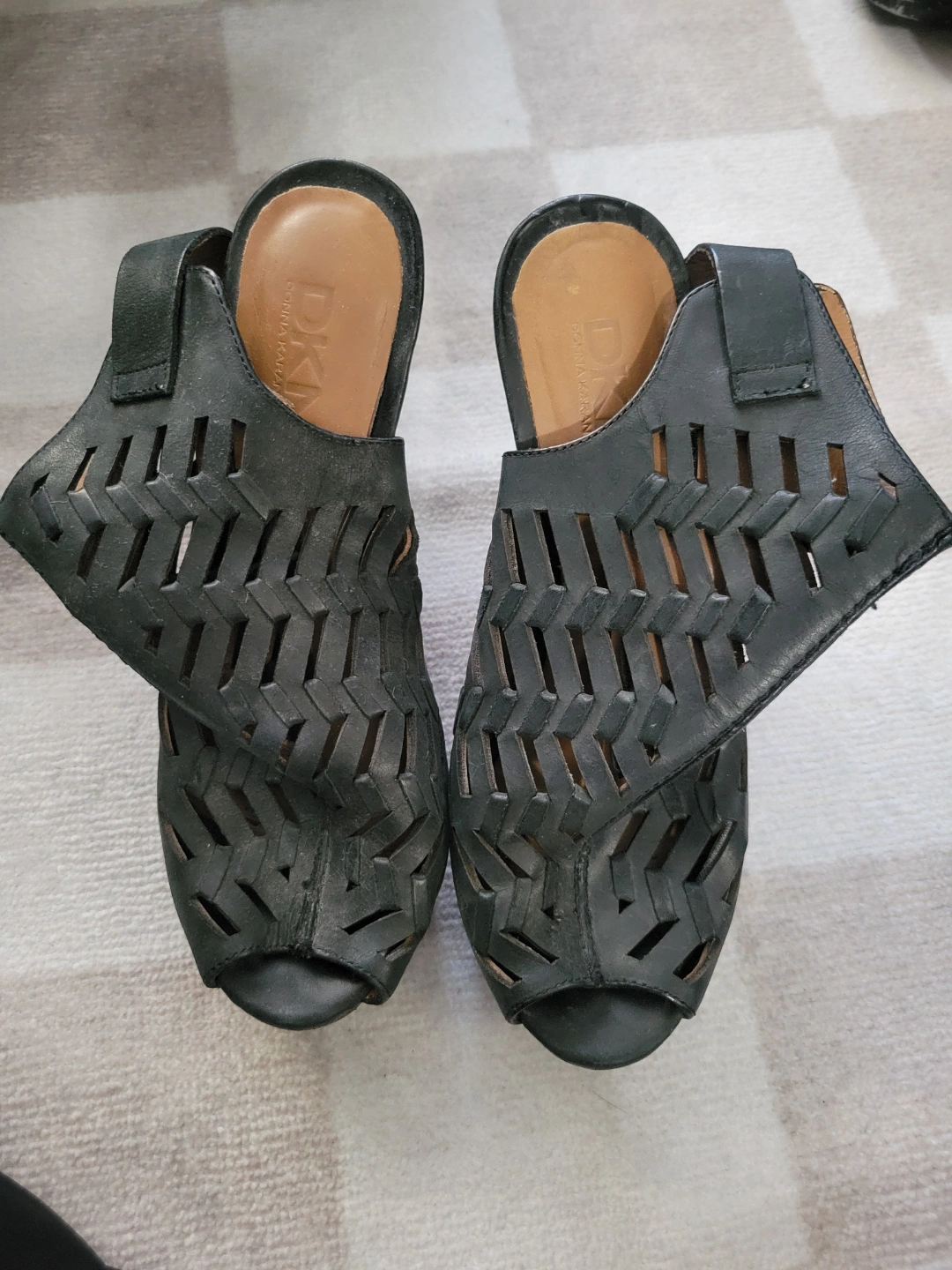 DKNY Cecile Black Leather Wedge Sandals - Size 6.5/37