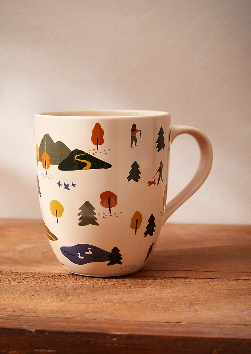 White ceramic mug with a forest scene design. It features trees, hills, and people walking in the woods.