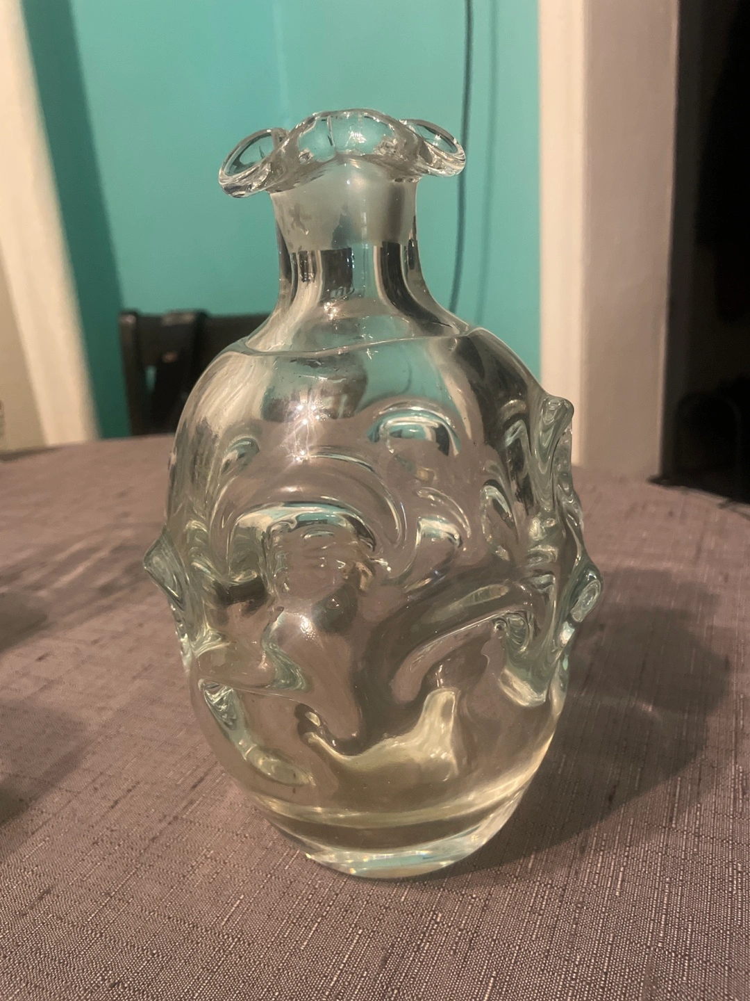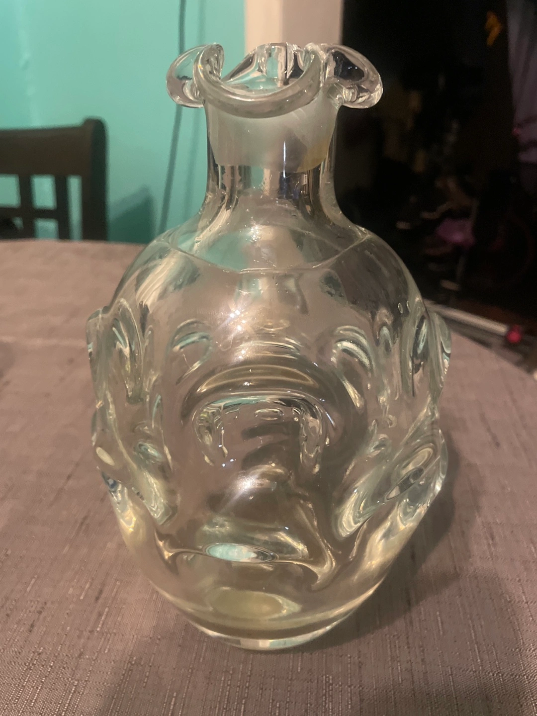 34Clear glass decanter with a unique design. The decanter has a fluted design and a wide base. The decanter is in good condition.