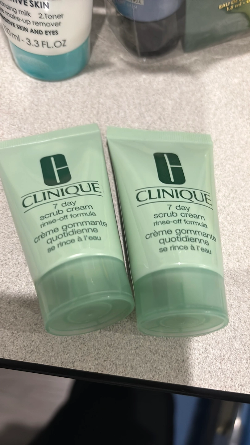 Two tubes of Clinique 7 Day Scrub Cream Rinse-Off Formula in travel size. 15 mls sells for $10 plus tax This is double the size -30 ml x 2 tubes