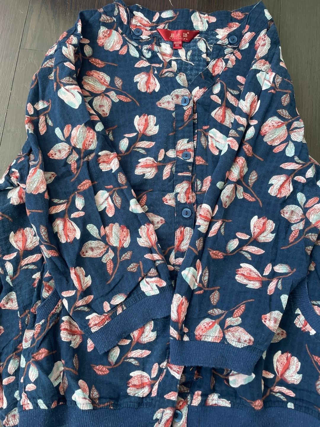 607Long sleeve button up blouse with floral print. Blue and red colour scheme.