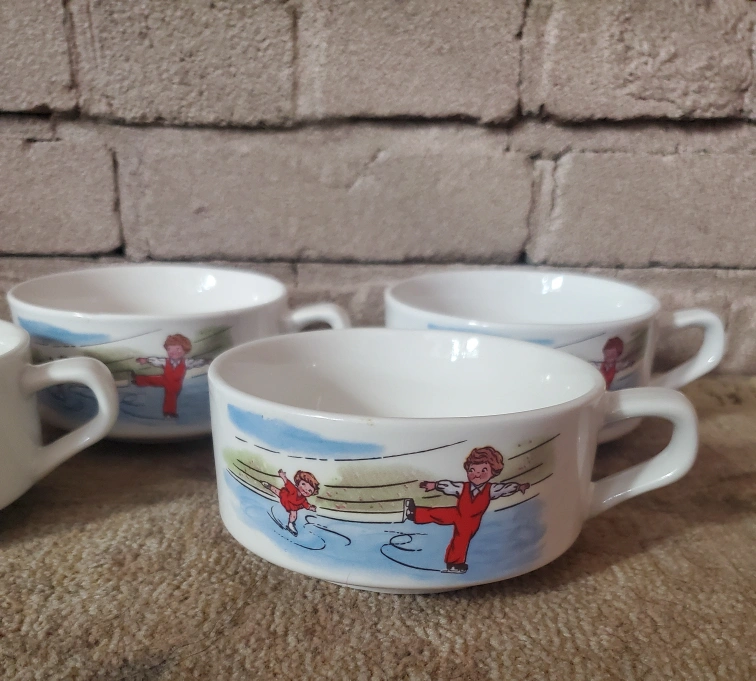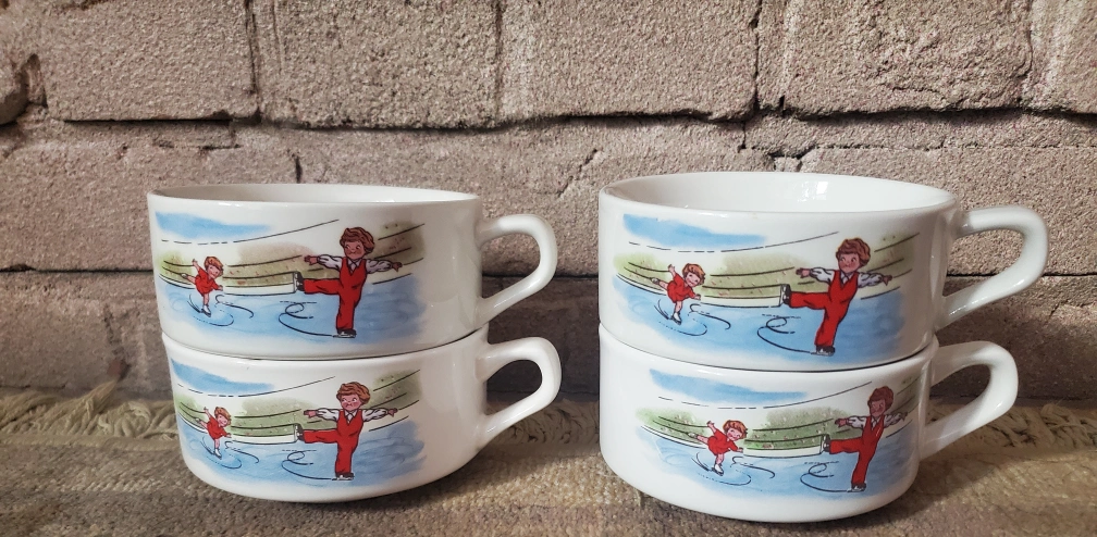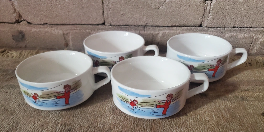 71So fun! Set of 4 ceramic Campbell's Kids soup mug with the Skating pattern brings nostaligic feels. Pieces feature a clean white finish, handles and colorful patterns on both sides. Besides being a great way to enjoy your favorite soup (maybe with some grilled cheese on the side to complete the retro feel), this piece would also make great vintage decor, is great for collectors, and works nicely with contemporary, retro, cottage and modern farmhouse styles. There were other styles in the series from back in the day...including Hopscotch, etc. Note: We also have another set of 6 with different patterns available. Please see other ads. Condition: very good vintage condition with no chips, cracks or obvious signs of wear. Dimensions: each bowl is 4.5 inches in diameter (excluding handle) x 2.25 inches tall. Pickup dufferin and Steeles area or delivery available for a fee.