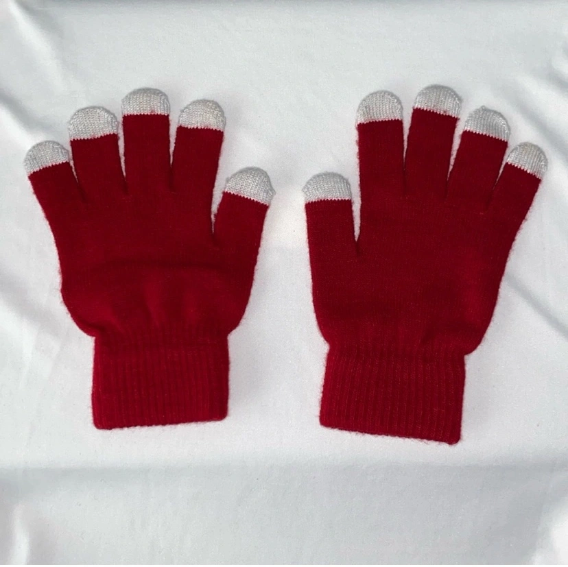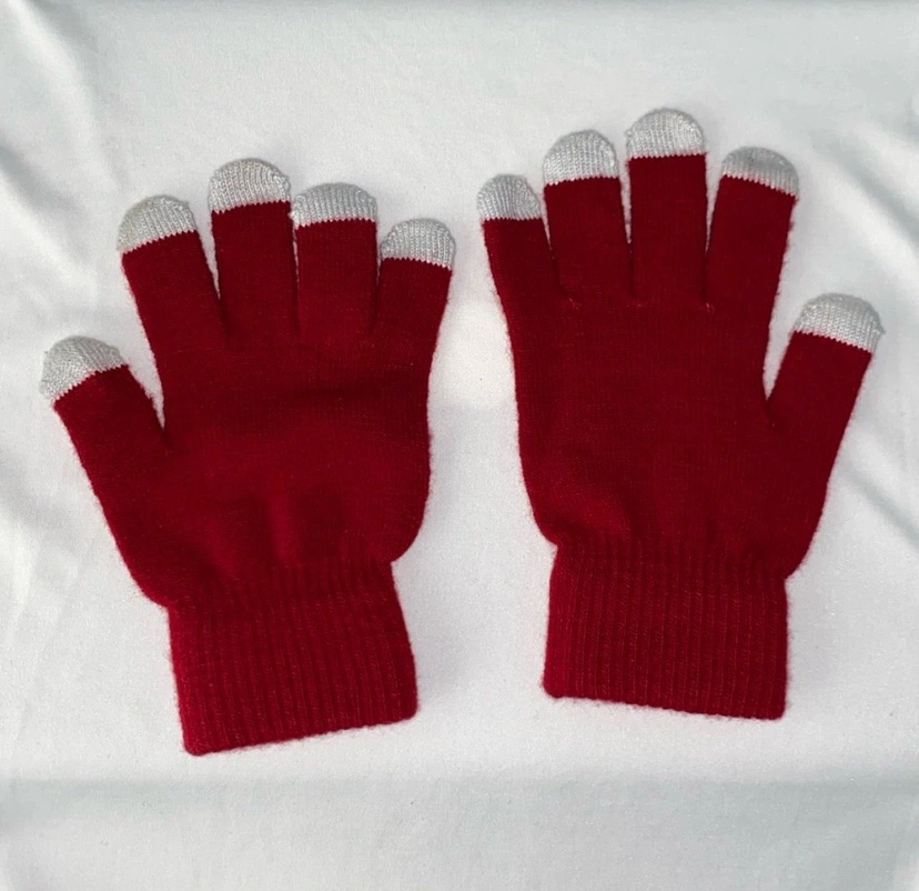 76Red touchscreen gloves with grey fingertips. Great for cold weather and using your phone. New red touch screen gloves in a burgundy deep red and with grey tips on the fingers that can be used on a touch screen cell phone. The quality looks a little loose between the fingers but when you try it on you won’t be able to tell.