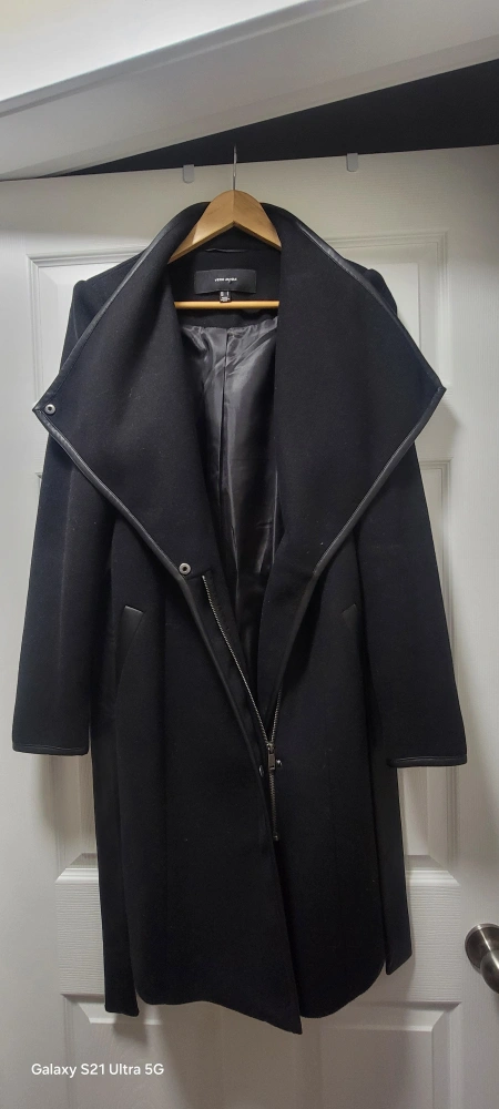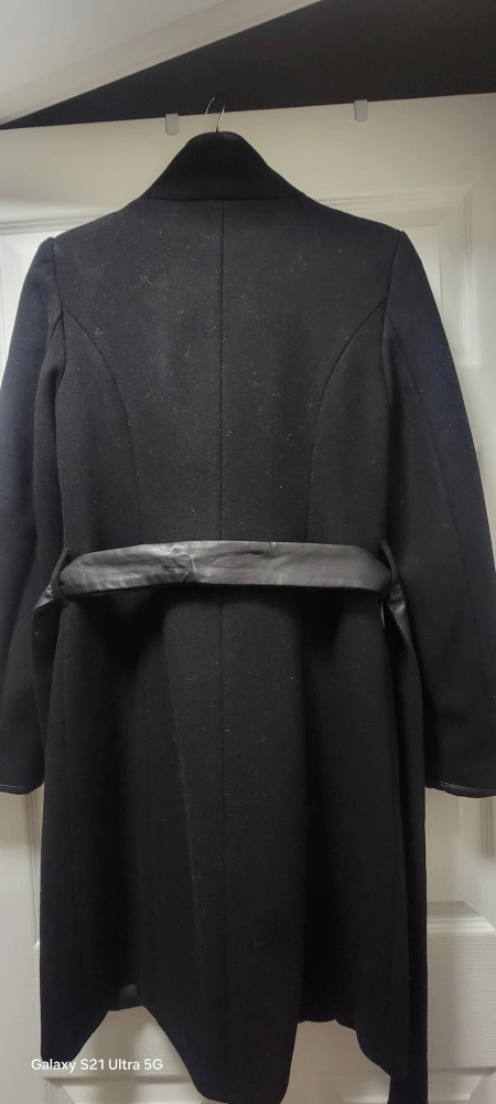 Black women's winter coat with a leather belt and leather trim. Long sleeves, zip up front, and a collar that can be worn up or down.