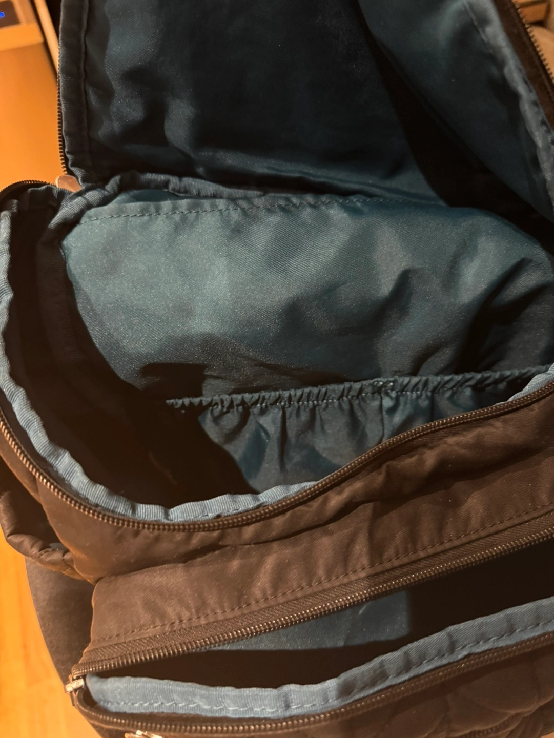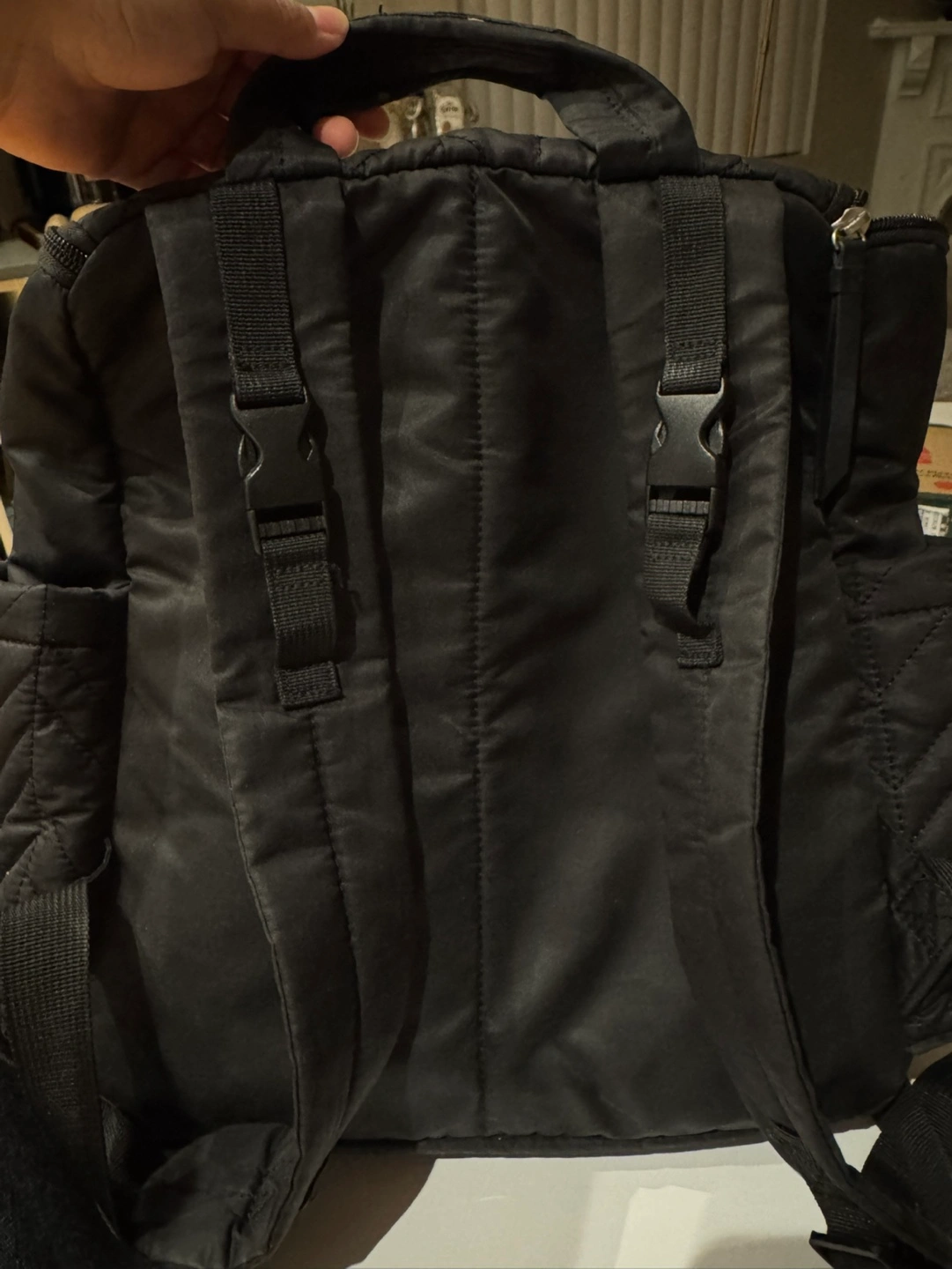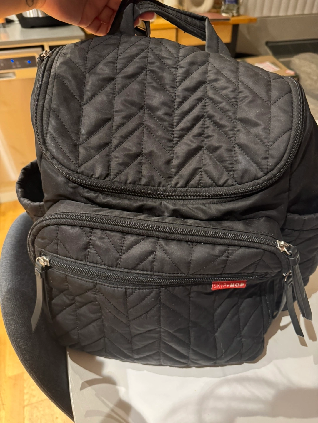 Black diaper bag backpack. Has a chevron pattern. Includes multiple pockets.