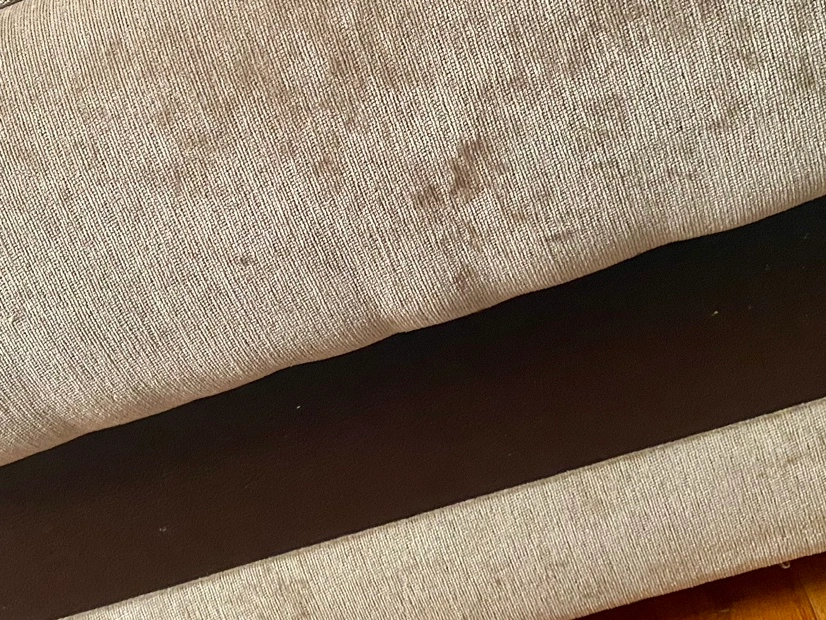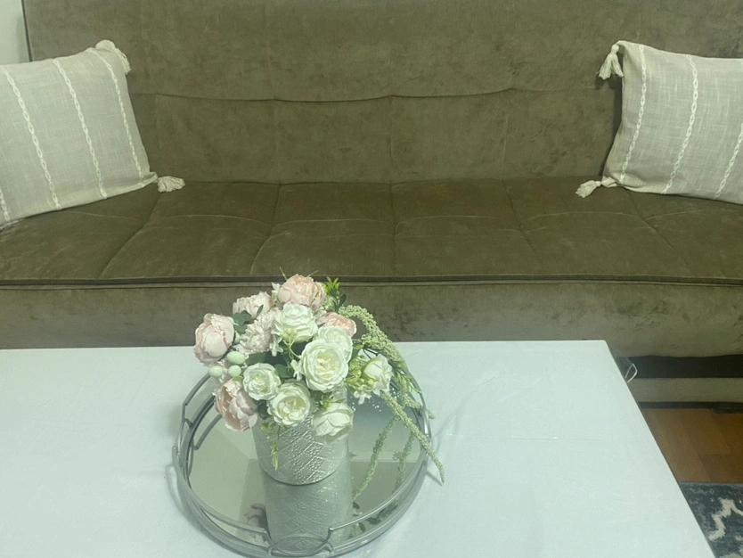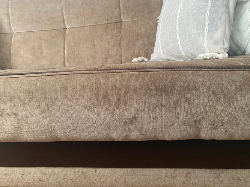 velvet sofa with storage. You can make the sofa into bed. Also it has huge storage , three people sit, The sofa has a wood frame and a dark wood finish. It is in good condition, my lighting is not justifying the sofa. I took the picture at night. It look better in person.