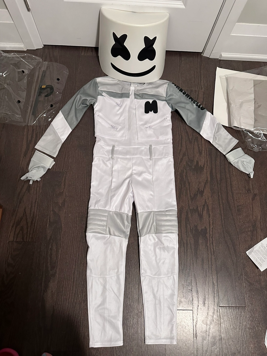 727Spirit Halloween - Marshmallow Jumpsuit child size small 4-6. This officially licensed Marshmello costume will have your little one looking like their favorite DJ. Coming complete with a black and white jumpsuit and the iconic Marshmello mask, they’ll be all ready to go! Officially licensed Includes: Jumpsuit Half mask Long sleeves Zipper closure Material: Polyester, spandex, plastic Care: Hand wash