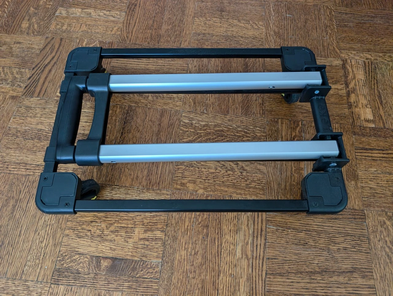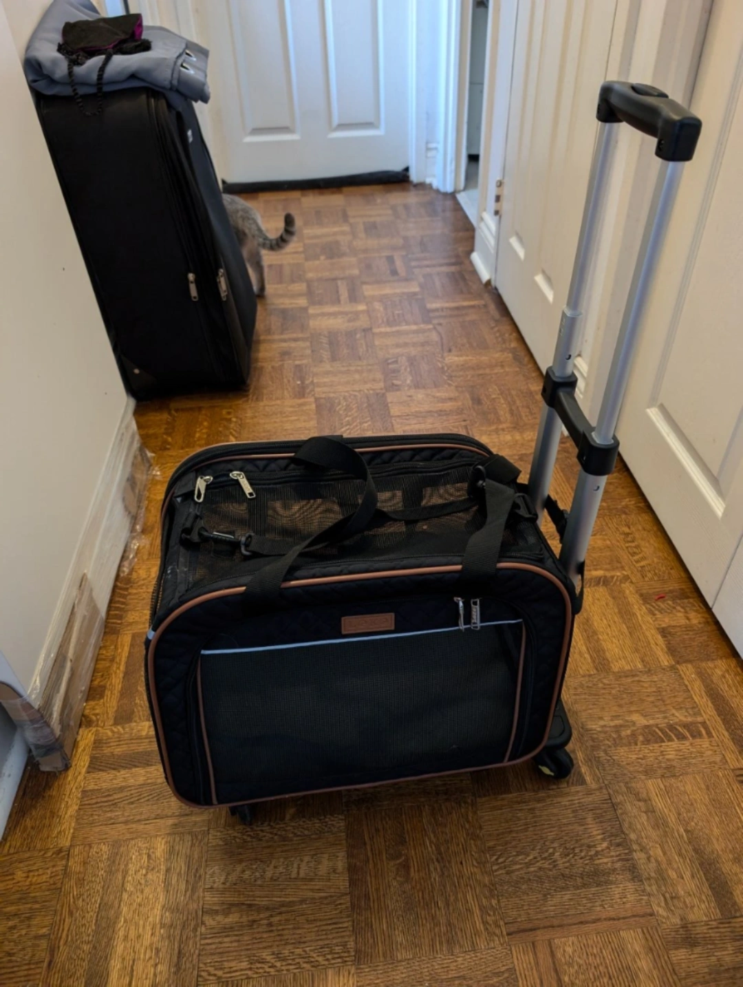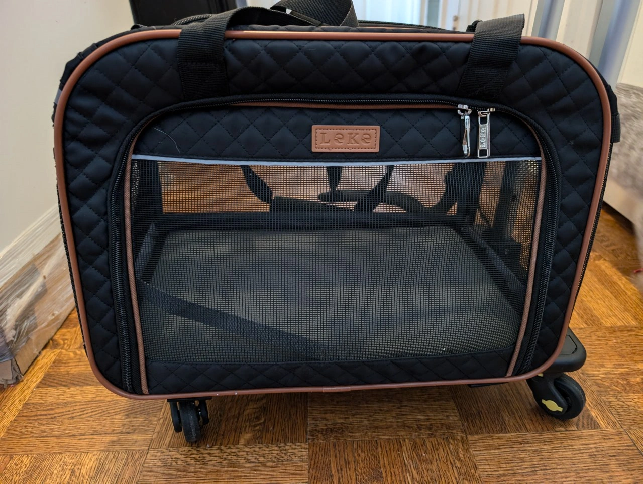 127Black pet carrier with wheels. Includes a removable pad. Has a retractable handle.