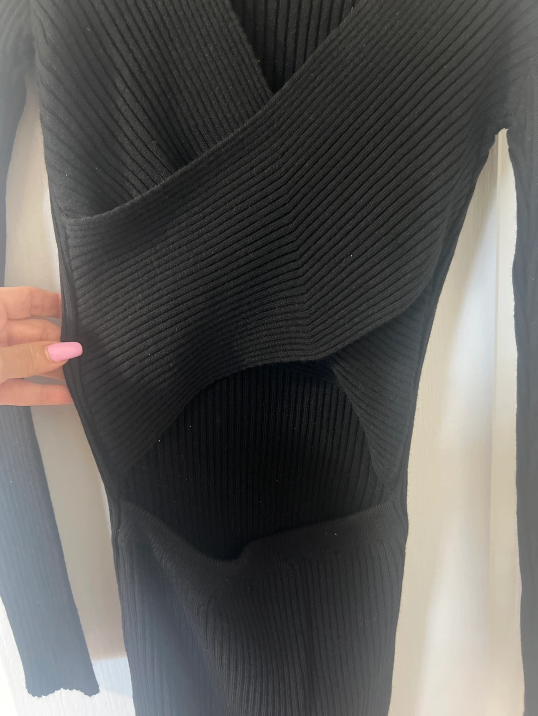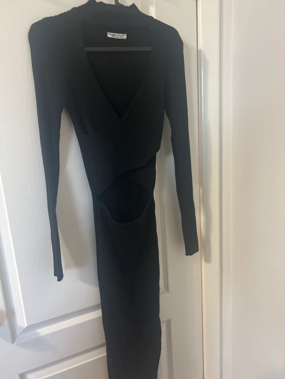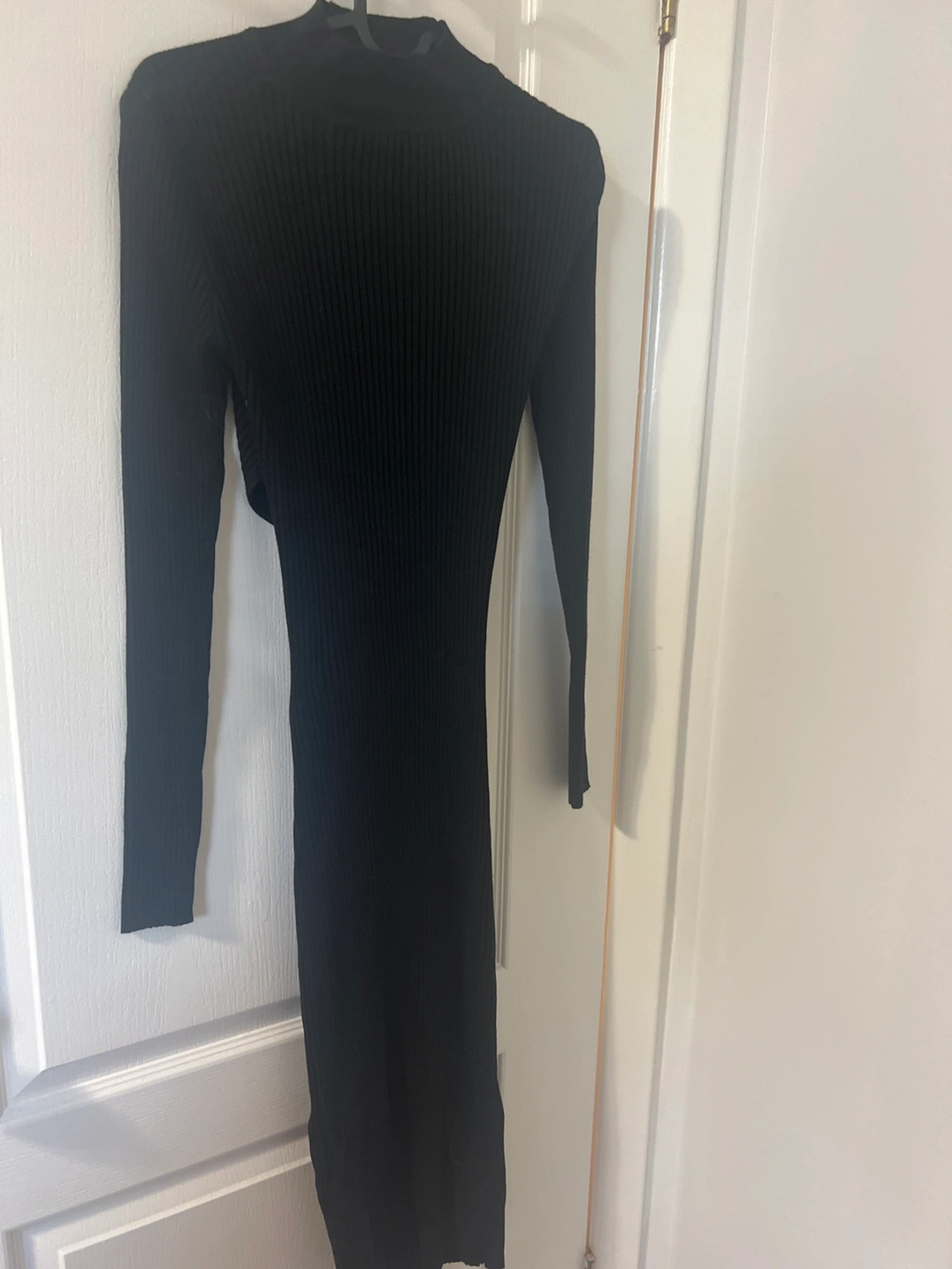 96Long-sleeved, black knit dress with a cutout detail at the waist. The dress is fitted and has a mock neck.