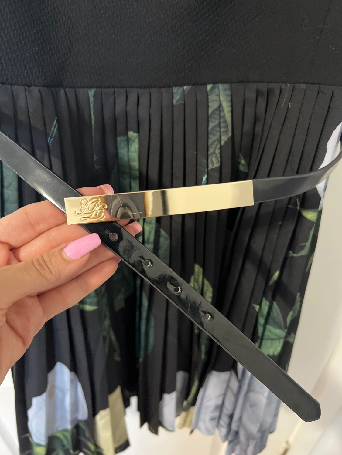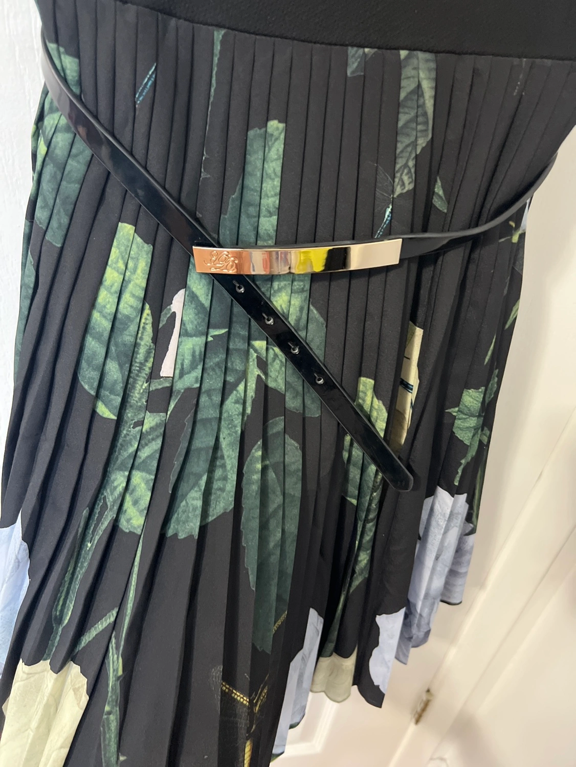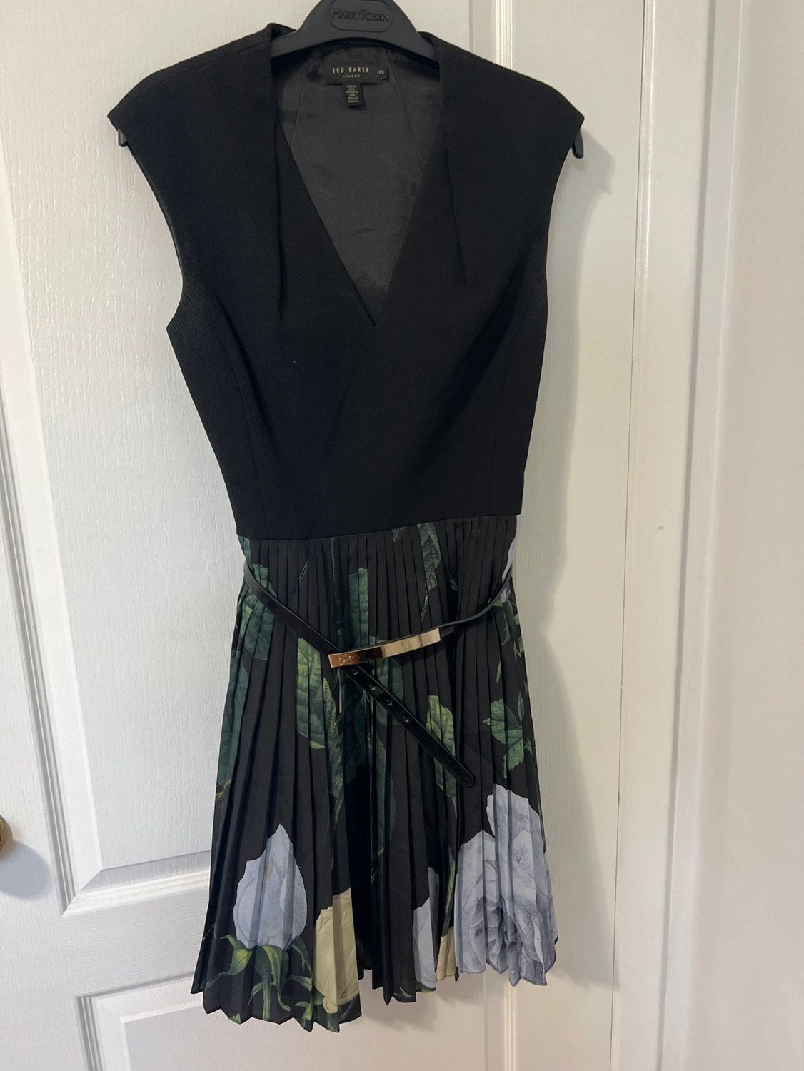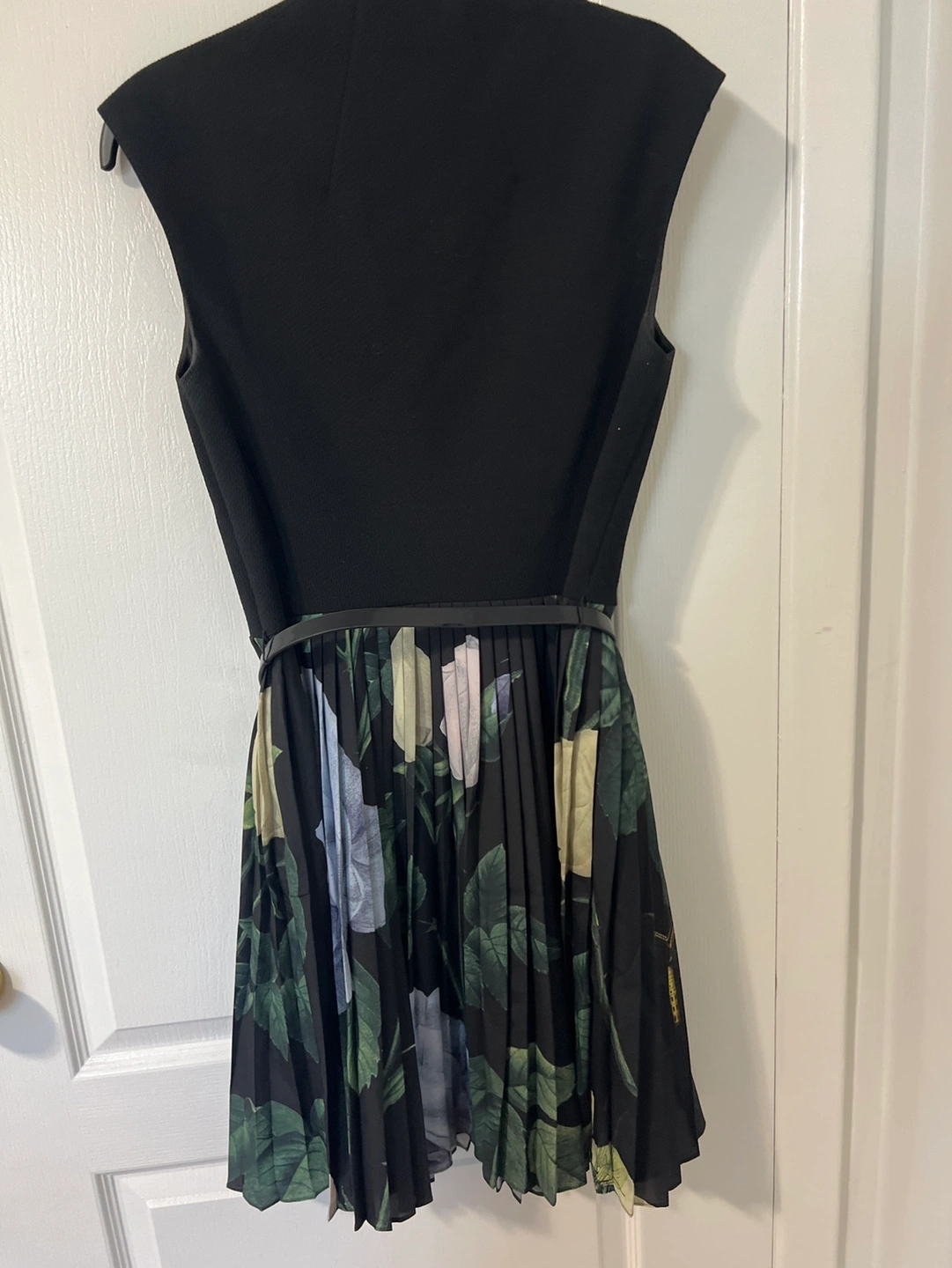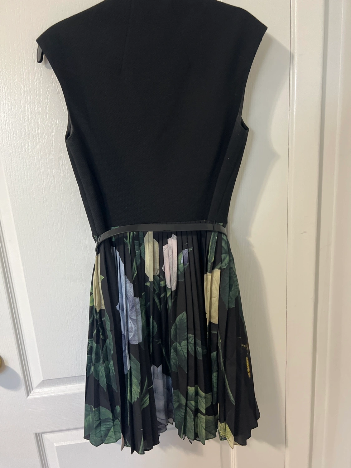 96Black and floral print dress with a pleated skirt. Includes a black belt with a gold buckle. Sleeveless with a V-neck.