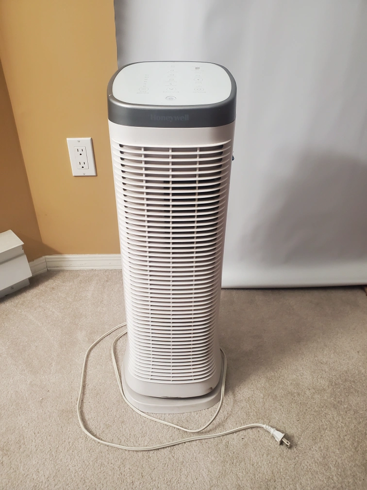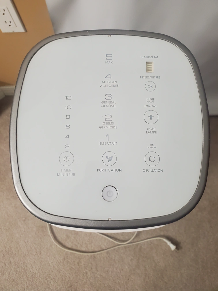 Air purifier, comes with power cord. Includes multiple settings, including timer, oscillation, purification and sleep/night.